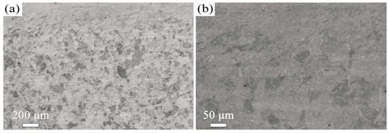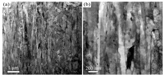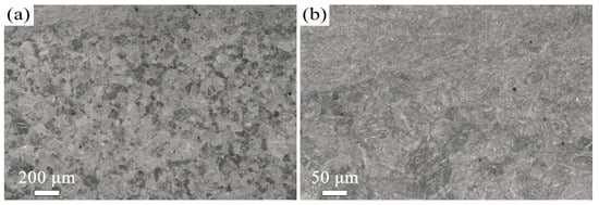 Room temperature tensile tests were conducted using a universal testing machine (SUNS UTM4204X, Shenzhen, China) with a strain rate of 0.0001 s−1. The tensile samples were machined to a gauge length of 7.5 mm with a cross-section of approximately 2 mm × 2 mm. The reproducibility of the data was affirmed by conducting three tests per sample. Vickers microhardness measurement was conducted using an HV-1000 tester (Najing times testing equipment Co., Ltd., Nanjing, China) with a load of 2.94 N, following the ASTM E92-17 standard []. Each reported hardness value represented the average of three individual measurements.