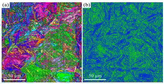 EBSD results of the T600-USSR sample: (a) IPF mapping and (b) KAM mapping.