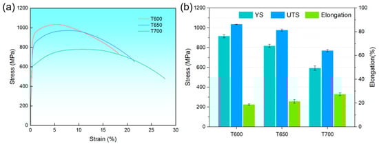 (a) Tensile curves and (b) mechanical properties of the T600, T650 and T700 samples. YS denotes yield strength; UTS denotes ultimate tensile strength.