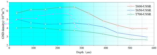 To quantify the gradient nanostructure, the EBSD data are divided into sub-regions by depth, and the GND density is calculated from KAM value. As shown in Figure 15, the GND density of all three samples demonstrates a gradient distribution. This confirms that USSR generates a defect-free gradient nanostructured surface layer, where gradients in grain size and dislocation density accommodate the plastic strain. In comparison, a higher tempering temperature results in a finer grain size and a higher GND density in the surface layer. This inverse relationship suggests that the efficacy of the USSR processing in refining the microstructure diminishes with an increase in the tempering temperature.