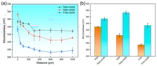 Figure 16a presents the variation in the microhardness as a function of depth for the three samples subjected to USSR processing. The results indicate a consistent decrease in hardness with increasing depth for all samples. This trend can be rationalized by the Hall–Petch relationship, which describes the inverse proportionality between strength and the square root of the grain size. Given that hardness is generally proportional to strength, the gradient nanostructure induced by USSR in 38CrMoAl steel results in a corresponding reduction in hardness. The gradient distribution of GND density also contributes to the gradient hardness profile through dislocation strengthening. Moreover, as the tempering temperature increases, the overall hardness profile shifts downward. In comparison, the T600-USSR sample exhibits a less pronounced hardness gradient, characterized by a smaller difference between its surface hardness and matrix hardness. Furthermore, with increasing tempering temperature, the surface hardness of the unprocessed sample gradually decreases. After USSR processing, the surface hardness is significantly enhanced to 354 ± 4 HV, 373 ± 5 HV, and 334 ± 7 HV, representing improvements of 7.3%, 22.7%, and 21.5%, respectively. A thickness increase is observed in the gradient nanostructured layer when the tempering temperature is raised, with measured values of 300 μm for the T600-USSR sample and 400 μm for the T700-USSR sample.