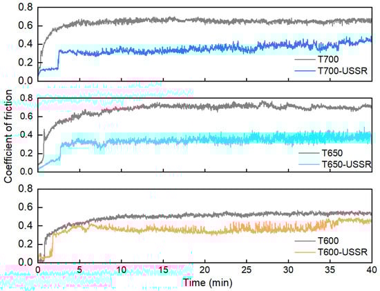 - After USSR processing, the samples tempered at 600 °C, 650 °C, and 700 °C exhibit a notable increase in surface hardness, reaching 354 ± 4 HV, 373 ± 5 HV, and 334 ± 7 HV, respectively—corresponding to improvements of 7.3%, 22.7%, and 21.5% over their unprocessed counterparts. Their wear volume decreases significantly by approximately 73%, 78%, and 60% for each tempering condition, respectively. Notably, the wear volumes of the samples tempered at 600 °C and 650 °C are comparable and substantially lower than that of the sample tempered at 700 °C. USSR treatment also leads to a reduction in the coefficient of friction.