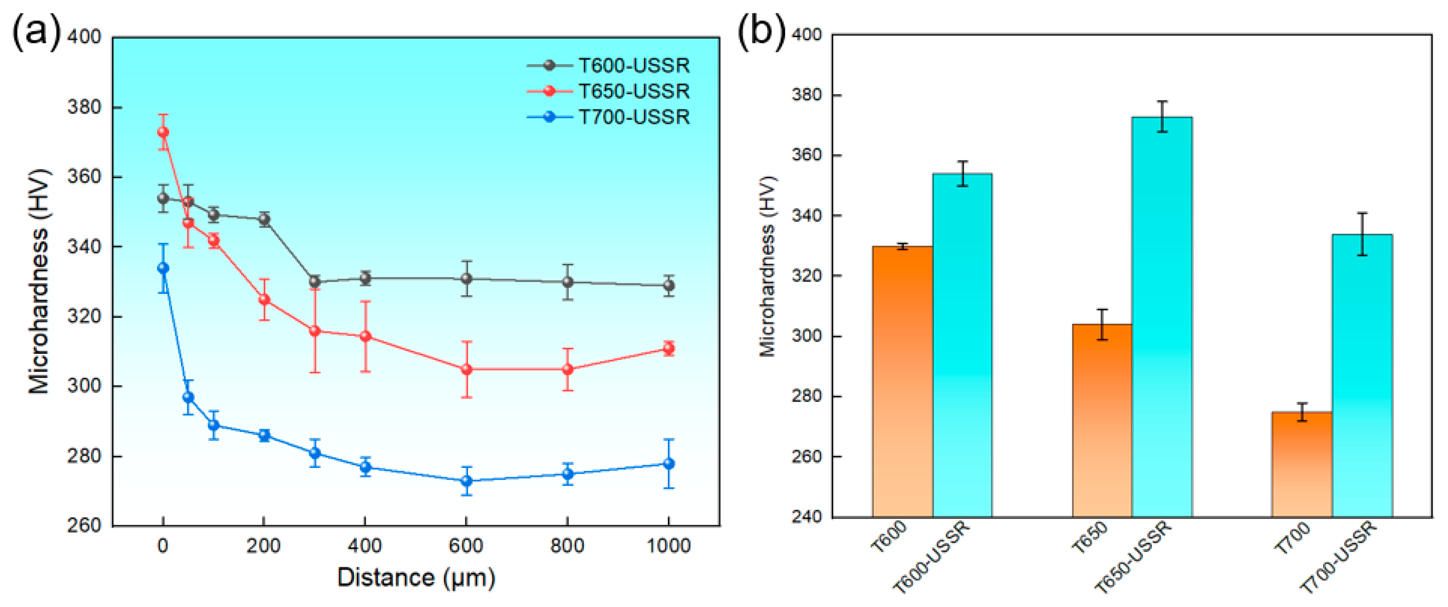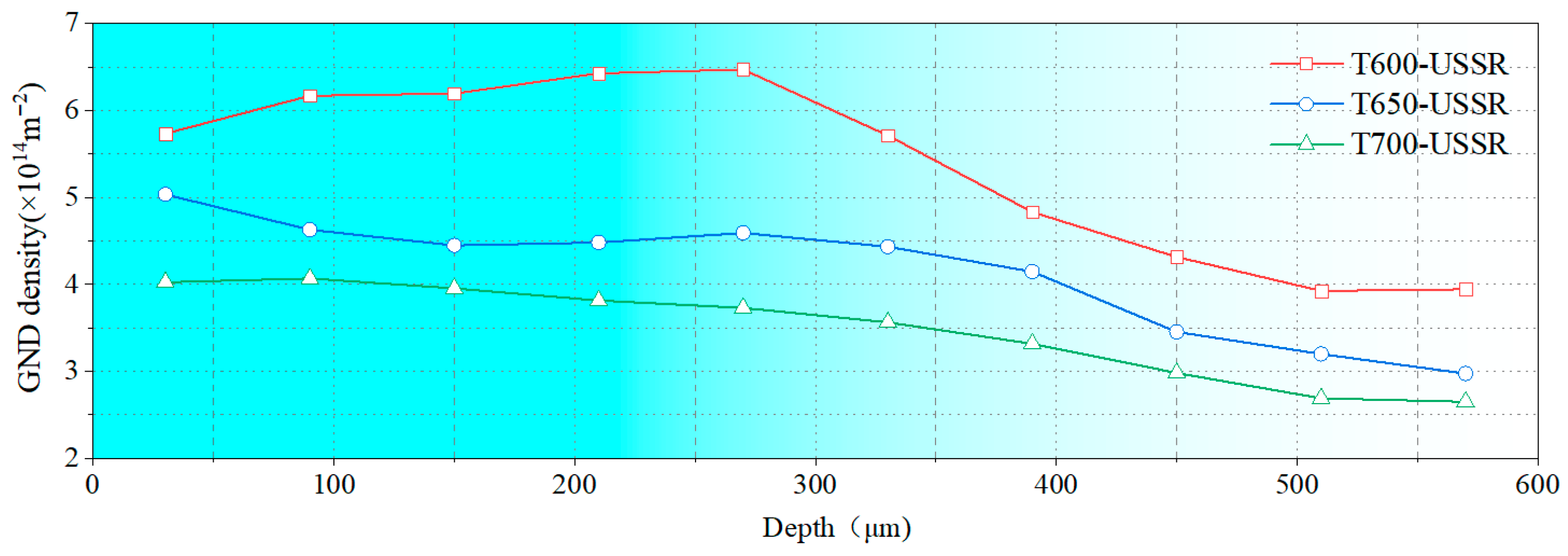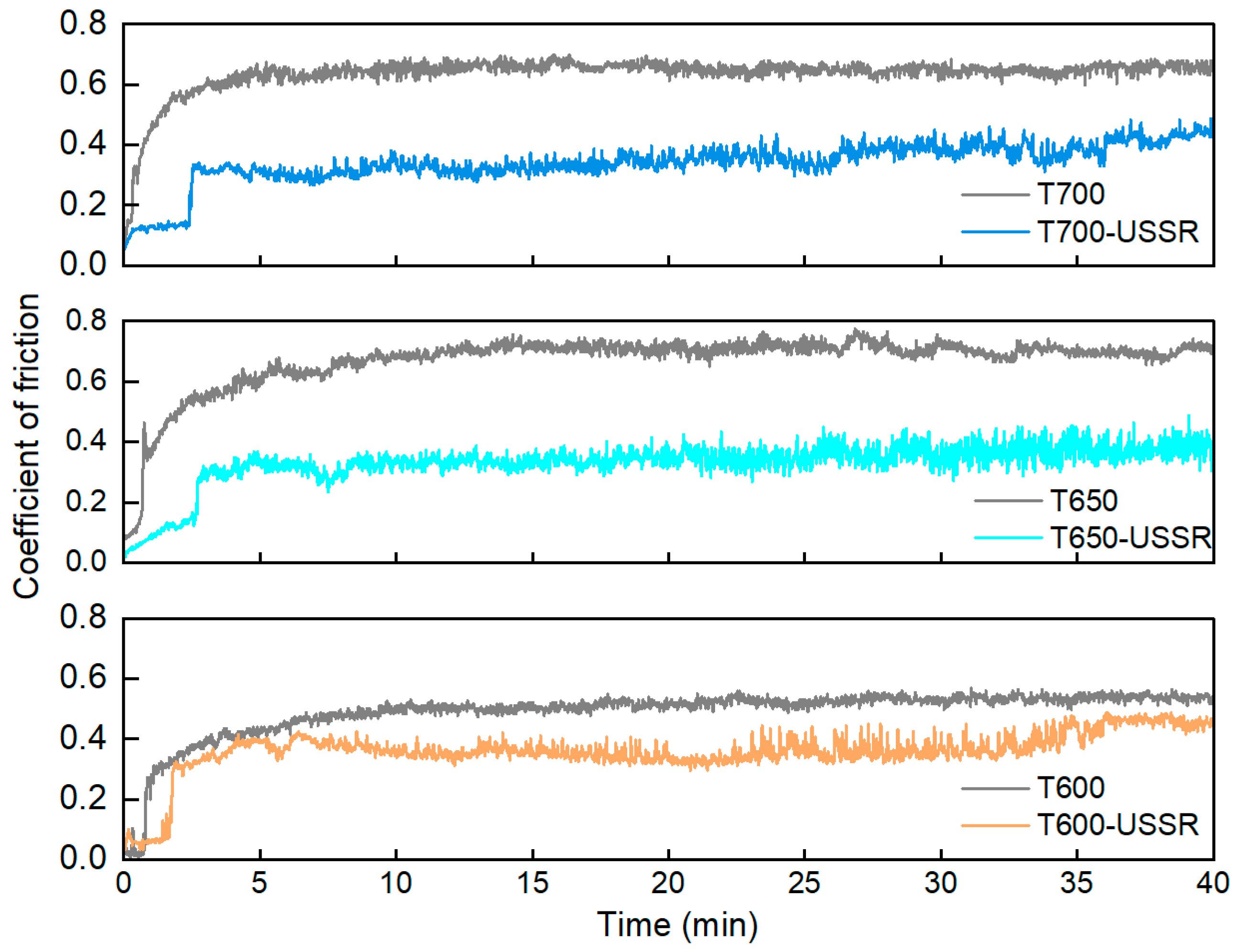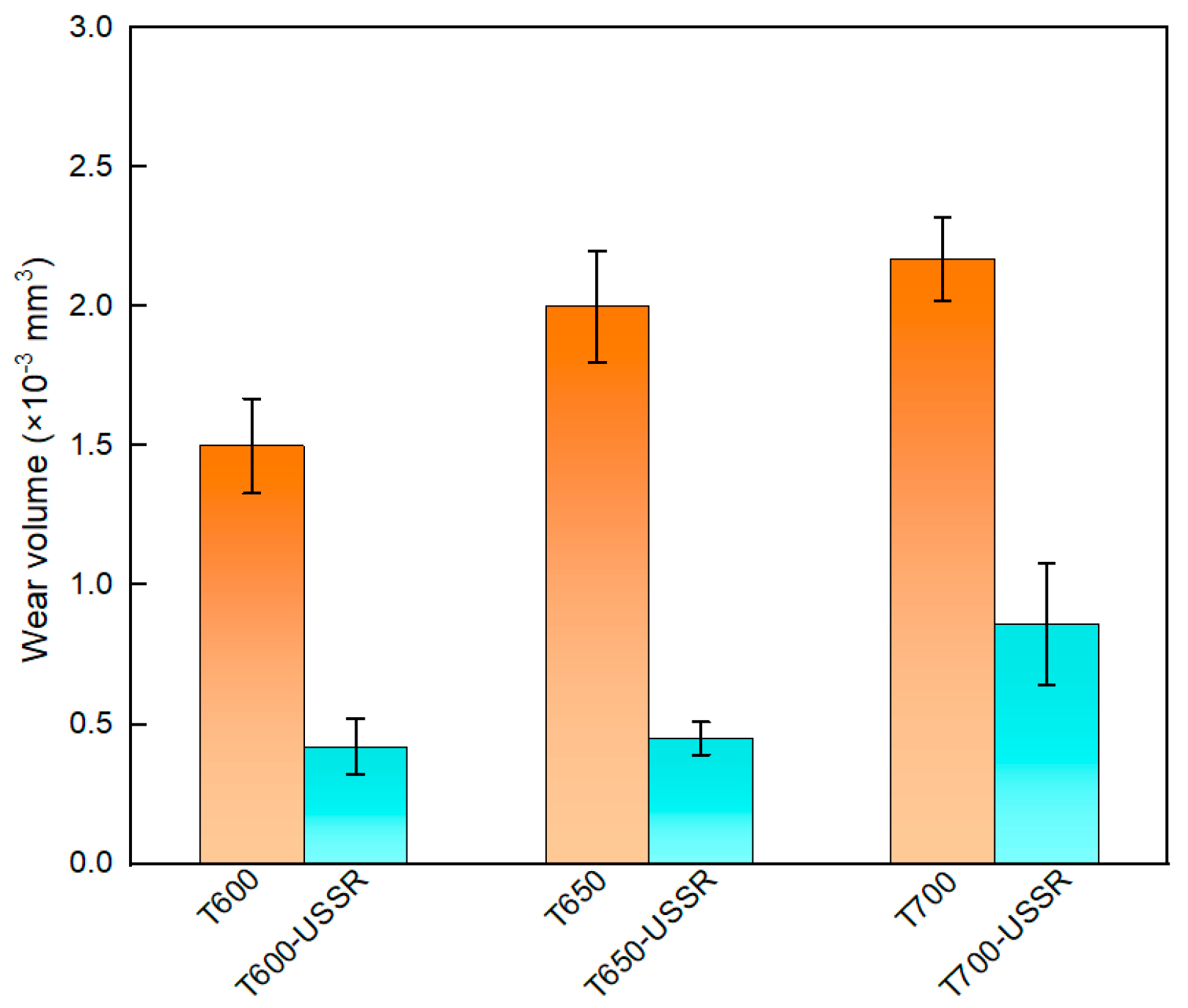- After USSR processing, the samples tempered at 600 °C, 650 °C, and 700 °C exhibit a notable increase in surface hardness, reaching 354 ± 4 HV, 373 ± 5 HV, and 334 ± 7 HV, respectively—corresponding to improvements of 7.3%, 22.7%, and 21.5% over their unprocessed counterparts. Their wear volume decreases significantly by approximately 73%, 78%, and 60% for each tempering condition, respectively. Notably, the wear volumes of the samples tempered at 600 °C and 650 °C are comparable and substantially lower than that of the sample tempered at 700 °C. USSR treatment also leads to a reduction in the coefficient of friction.