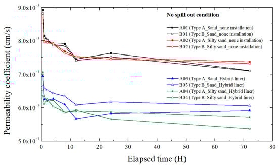 When the hybrid liner was installed (A03–A04, B03–B04), the permeability coefficients ranged from 5.6 × 10−3 to 6.5 × 10−3 cm/s, which are slightly lower than those of the non-installed cases. However, this reduction does not indicate flow obstruction. The continuous decrease in permeability coefficient with elapsed time suggests a minor compaction and improved contact between the liner and surrounding soil, resulting in a more consistent flow path rather than blockage. Therefore, it was confirmed that the hybrid liner slightly impedes groundwater flow, but not significantly, and ensures hydraulic continuity.