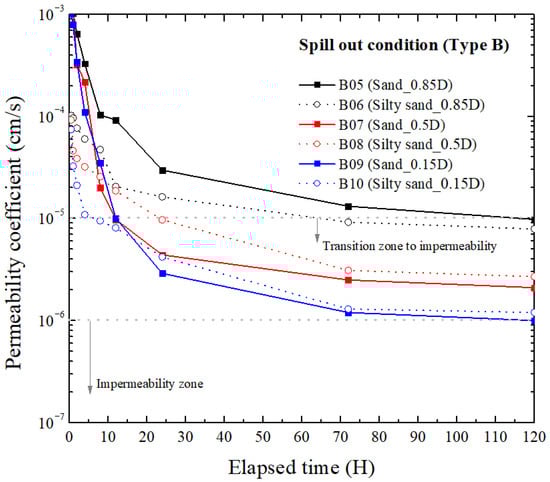 The experimental results of Type A under the spill out condition are presented in Figure 5. The permeability coefficient showed a distinct decreasing trend over time, and in all cases, the values remained below 10−3 cm/s, which is the general permeability range of pure sand. At 10 h, all six cases were within the transition zone to impermeability, and by 120 h, the measured permeability coefficient converged to a range between 2 × 10−7 and 6.5 × 10−7 cm/s, which coincides with the impermeability region indicated in the figure.
