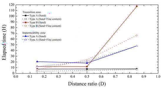 In Type B, t 0.15D, Type B showed a similar trend to Type A. However, at distance ratios ≥ 0.5D, the arrival time became much longer in fine-containing soils than in pure sand, whereas at 0.85D the arrival time became longer in pure sand. This occurs because the mixed reactive layer of Type B requires a continuous oil supply above a threshold flux/concentration to enter the transition zone. At 0.15D, the short path supplies enough oil to both soils, so the behavior resembles Type A. At 0.5D, fines retain/adsorb/disperse TPH in micro-pores, reducing the effective flux to the liner and delaying the threshold; thus the arrival time becomes longer in fine soils. At 0.85D, the long path causes greater loss/dilution in pure sand, so a sufficient local concentration cannot form near the liner, and the arrival time in pure sand becomes longer.