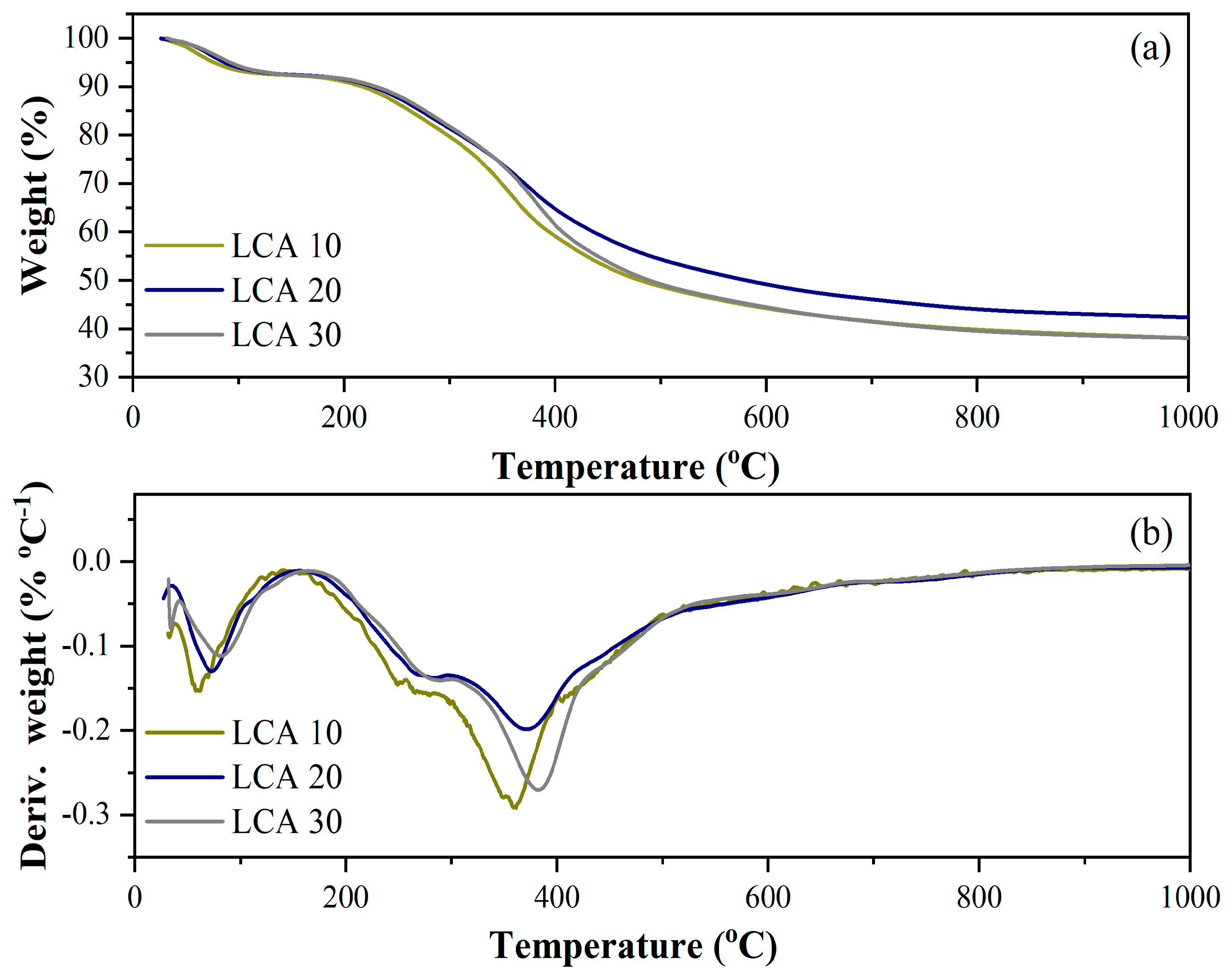 To determine the pyrolysis conditions of the sugarcane bagasse lignin, the effect of the different heating rate on the thermogravimetric curves was previously evaluated. Approximately 10 mg of sugarcane bagasse lignin were subjected to a non-isothermal heating program from room temperature to 1000 °C under a high-purity nitrogen atmosphere (99.997%) at a flow rate of 50 mL·min−1. Alumina crucibles were used in the analyses with thermal analyzer (Discovery SDT650, TA Instruments, Hüllhorst, Germany). Heating rates of 10 °C· min−1 (LCA10), 20 °C·min−1 (LCA20), and 30 °C·min−1 (LCA30) were evaluated.