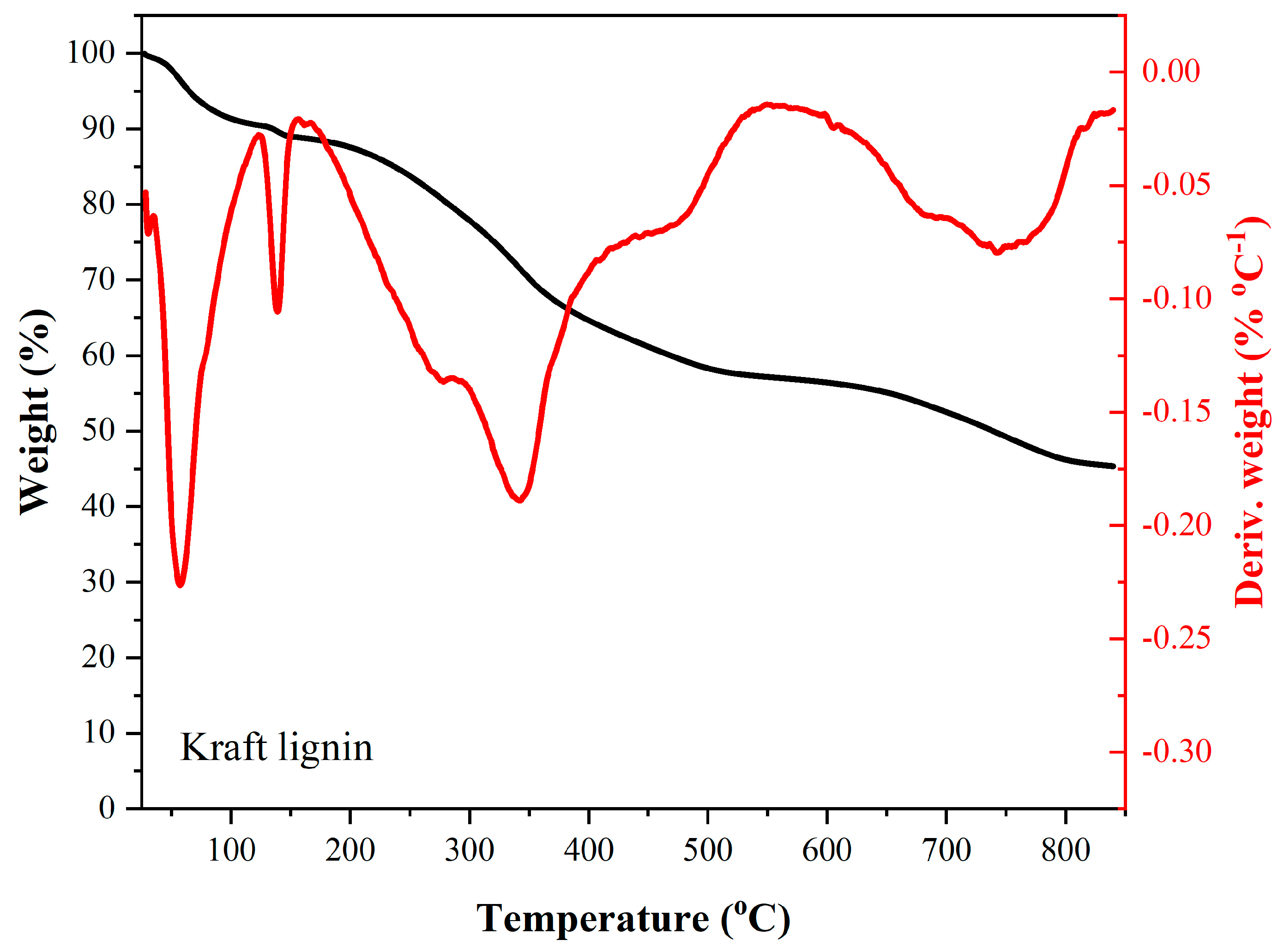Thermogravimetric analysis of kraft lignin (KL) was conducted under an inert atmosphere with a gas flow rate of 100 mL·min−1 and a heating rate of 10 °C.min−1. Alumina crucibles were used to analyze approximately 10 mg of sample in experiments performed on a thermobalance in a thermal analyzer (Discovery SDT650, TA Instruments, Hüllhorst, Germany), in which the sample were heated up to 850 °C.
