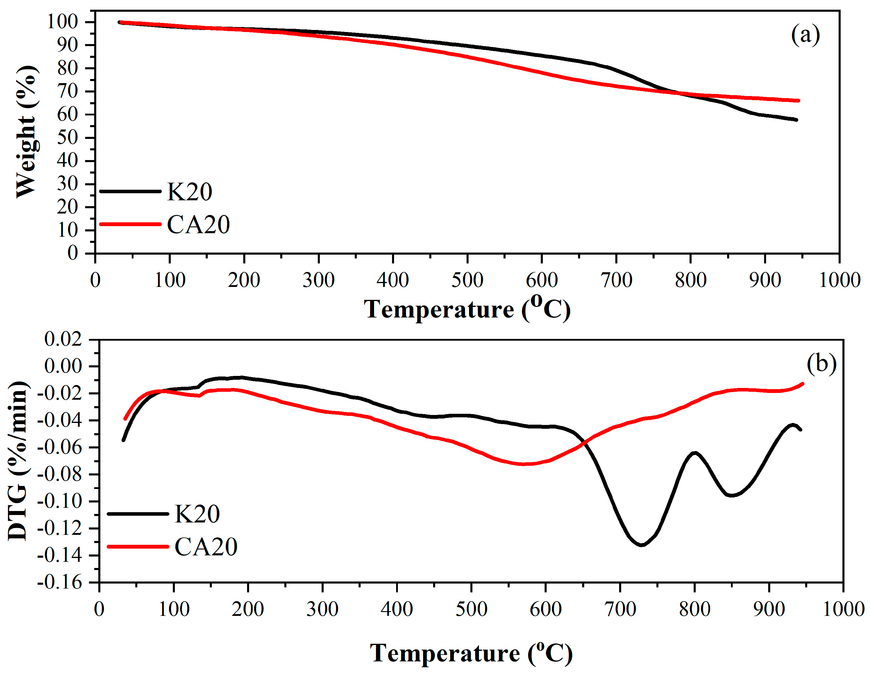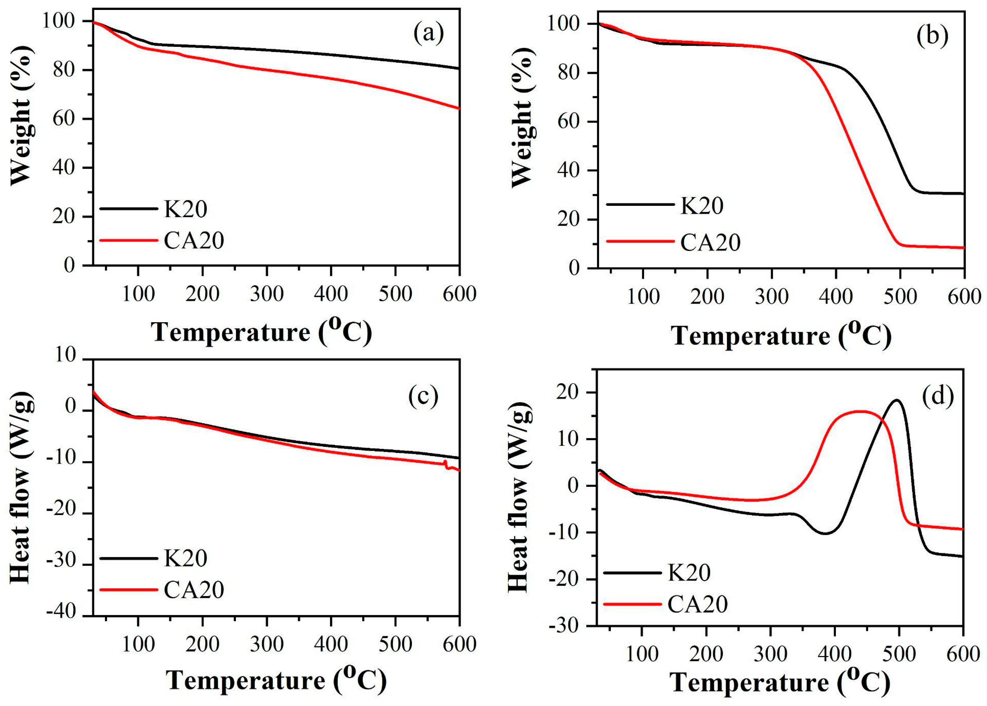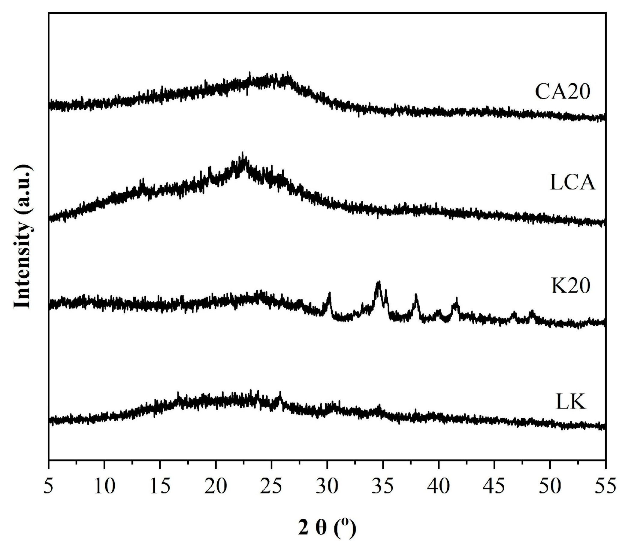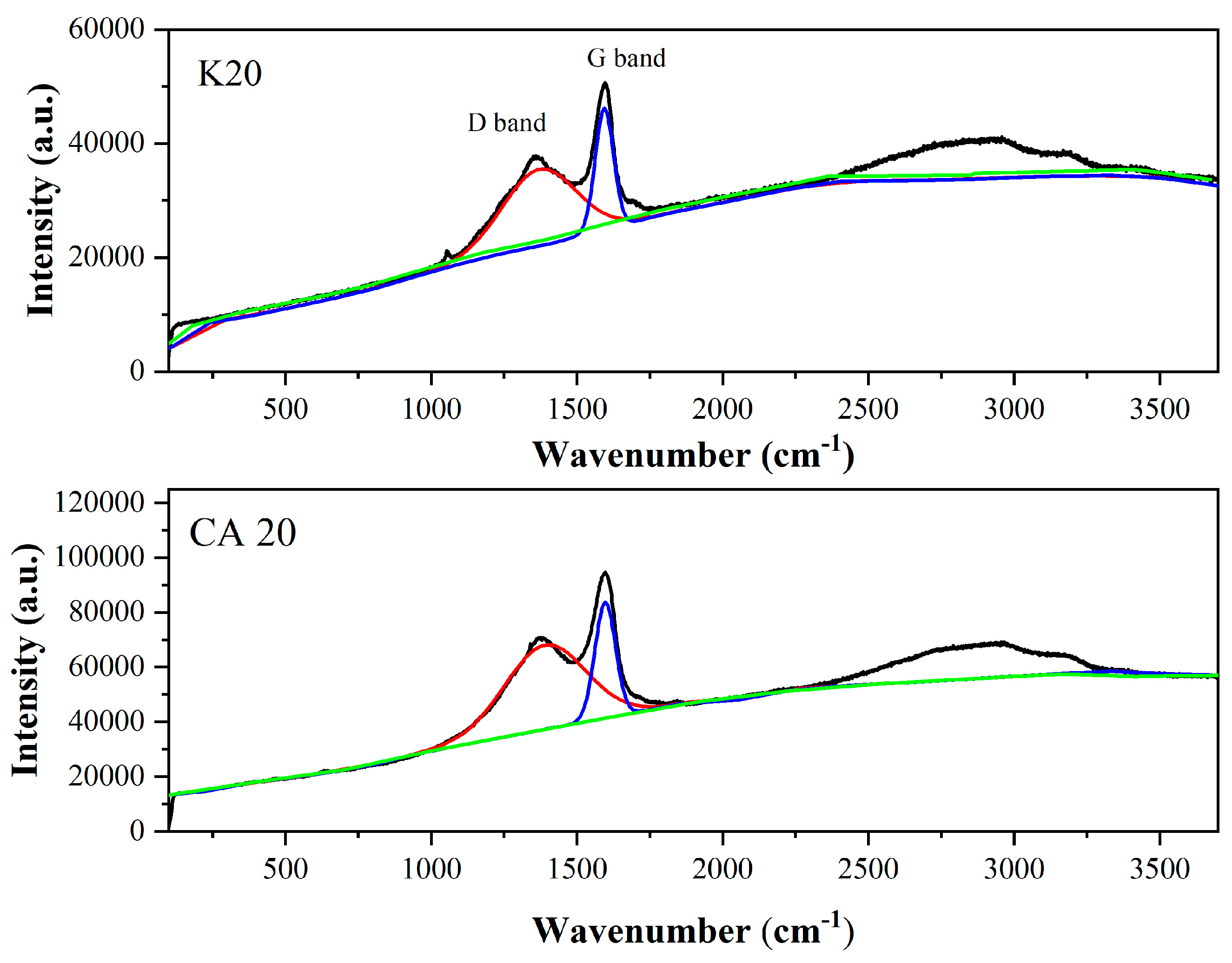 It is noteworthy that Raman spectroscopy and X-Ray diffraction (XRD) analyses provided complementary structural information. Raman analysis revealed a highly disordered carbon structure with small graphitic domains, while XRD confirmed the predominantly amorphous nature of the materials. These results indicate that both short-range (Raman) and long-range (XRD) ordering are limited in K20 and CA20.