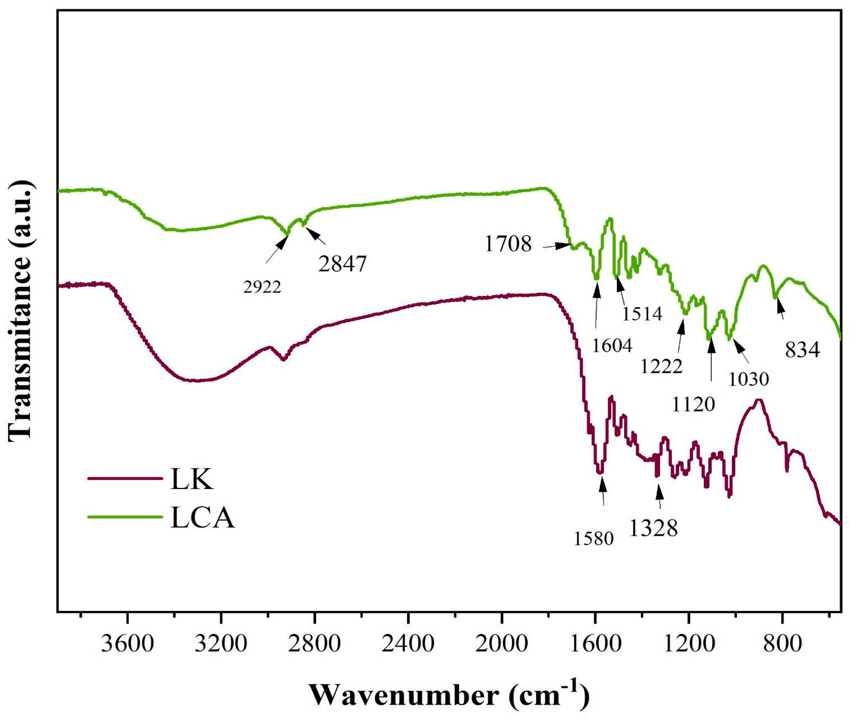 Figure 6 shows selected absorption bands in the infrared spectra of the lignin samples. For both kraft lignin (LK) and bagasse-derived lignin (LCA), prominent bands are observed at approximately 1605 cm