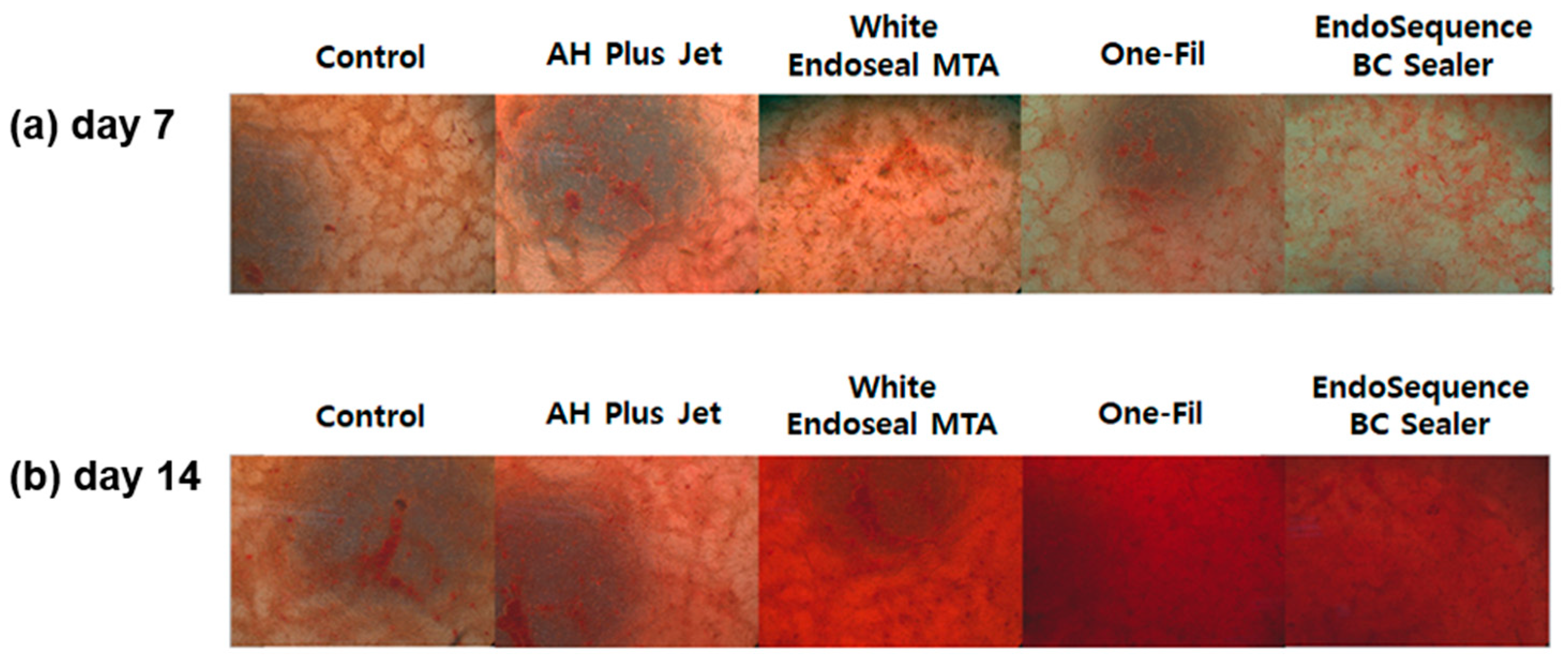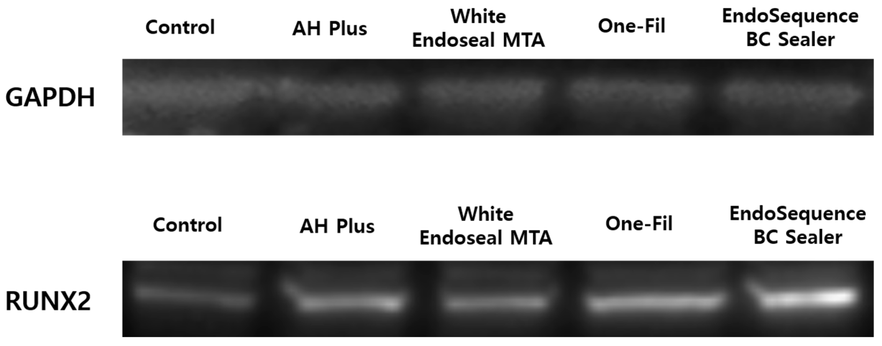 - Oh, H.; Kim, E.; Lee, S.; Park, S.; Chen, D.; Shin, S.J.; Kim, E.; Kim, S. Comparison of Biocompatibility of Calcium Silicate-Based Sealers and Epoxy Resin-Based Sealer on Human Periodontal Ligament Stem Cells. Materials 2020, 13, 5242. [Google Scholar] [CrossRef] [PubMed]