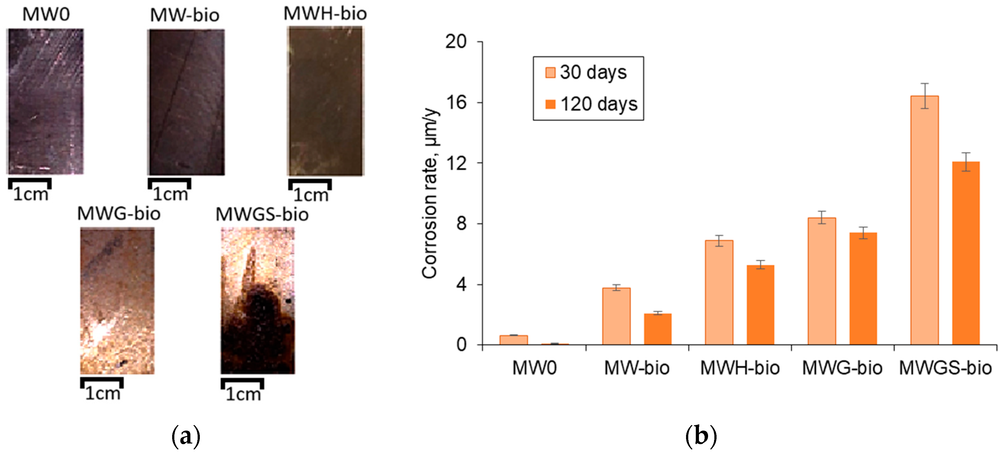 61. Javed, M.A.; Stoddart, P.R.; Palombo, E.A.; McArthur, S.L.; Wade, S.A. Inhibition or acceleration: Bacterial test media can determine the course of microbiologically influenced corrosion. Corros. Sci. 2014, 86, 149–158. [Google Scholar] [CrossRef]