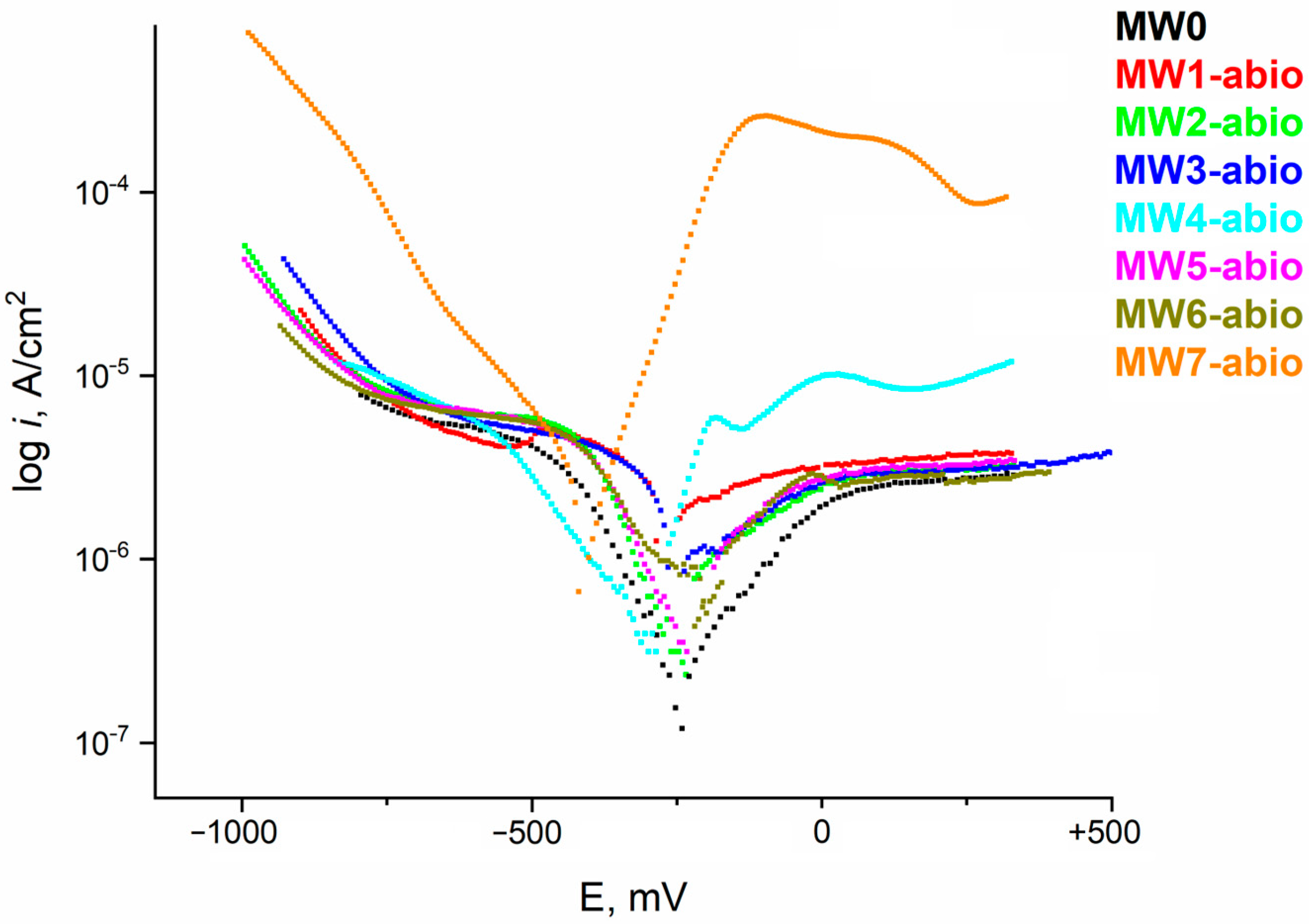 Measurement of corrosion rate by the potentiodynamic method. Potentiodynamic curves and corrosion potential were measured using a potentiostat Solartron SI 1287 (Solartron Analytical, Farnborough, UK). Measurements were carried out using a standard three-electrode cell.
