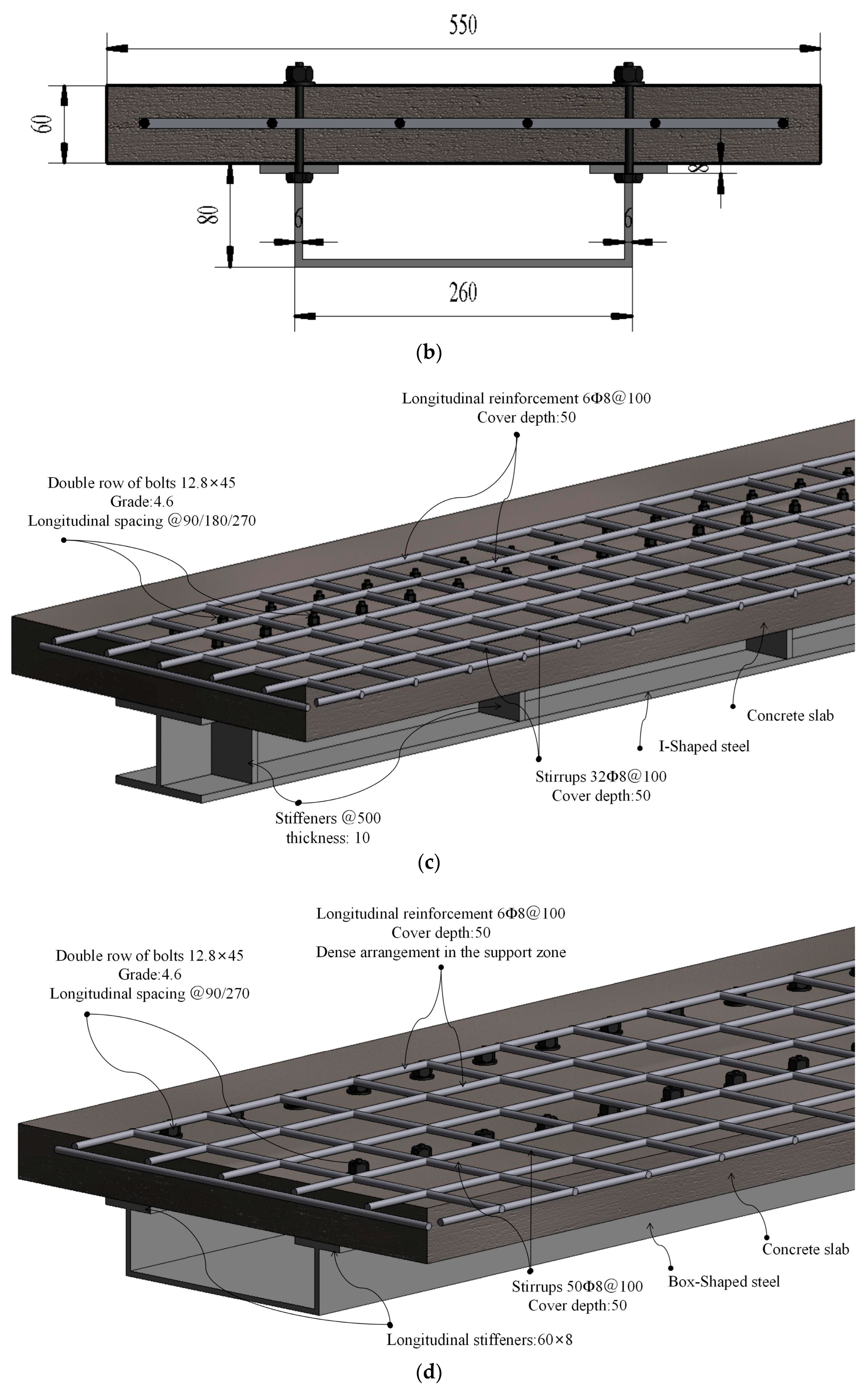 - Steel Beam Structure: The box-section steel beam had dimensions of 80 mm (height) × 260 mm (width), and the I-section steel beam had dimensions of 160 mm (height) × 100 mm (flange width). To improve the local stability of the steel beams and avoid premature local buckling of the steel beams during the test (which would affect result accuracy), 10 mm-thick diaphragms were installed every 500 mm along the length of the steel beams. Meanwhile, longitudinal stiffeners were added to the bottom of the box-section steel beams to further enhance their anti-buckling capacity.