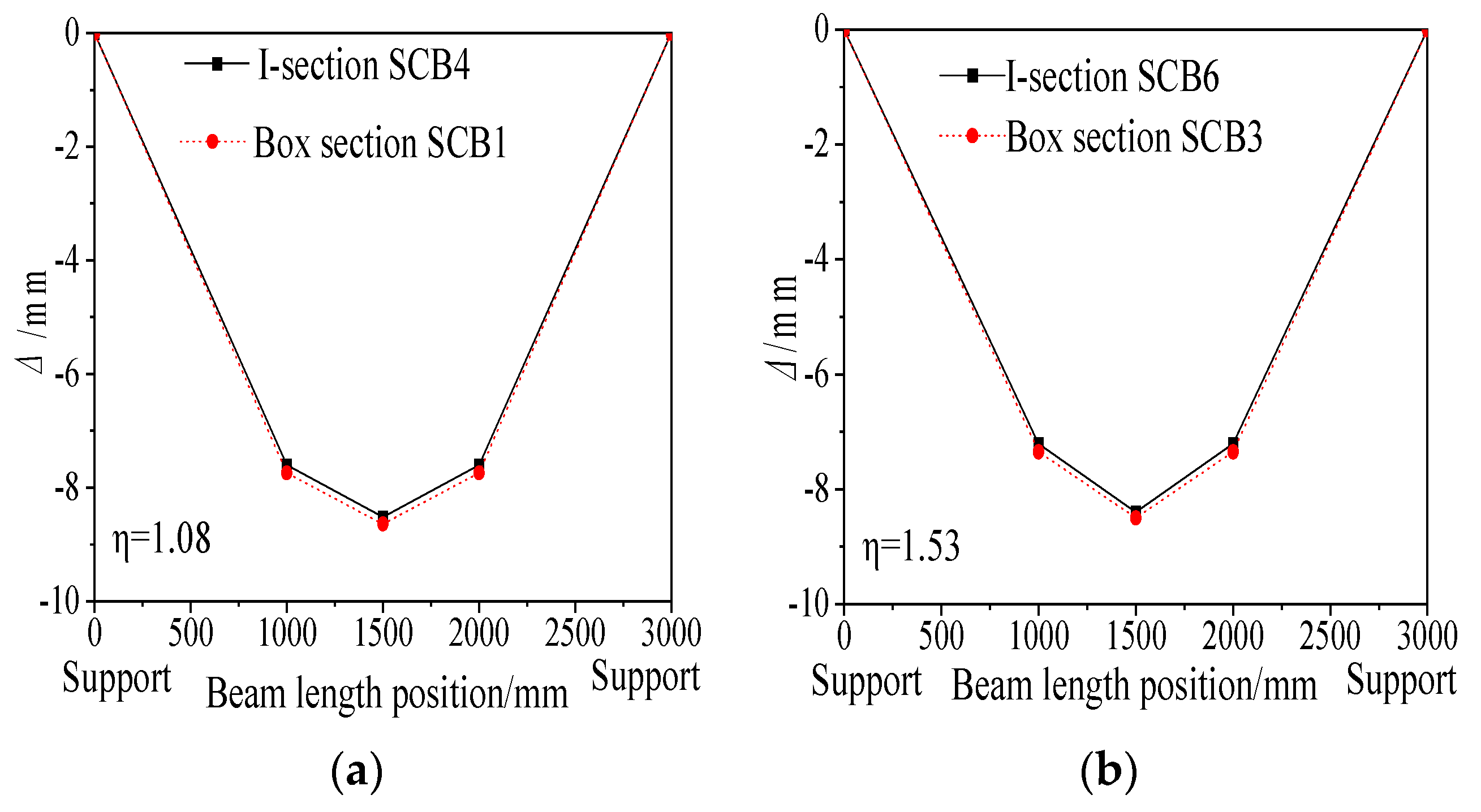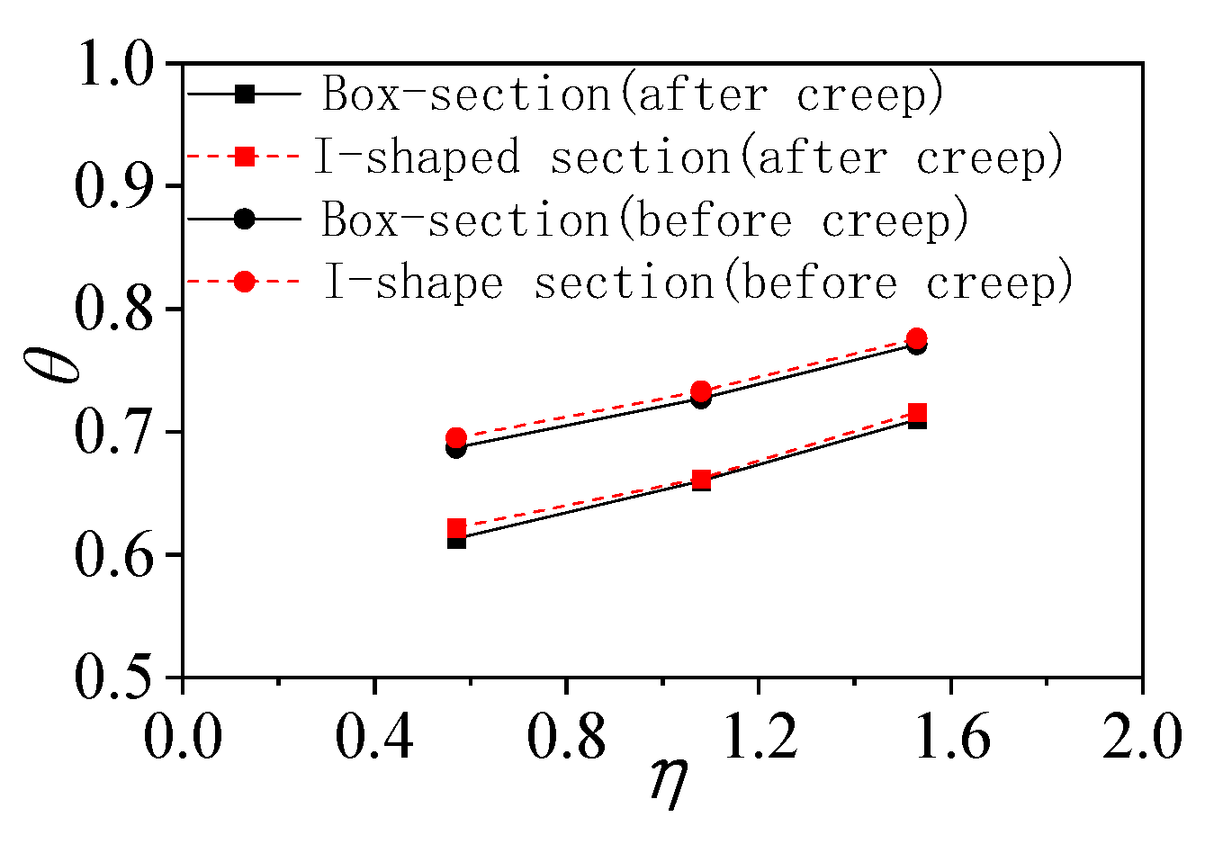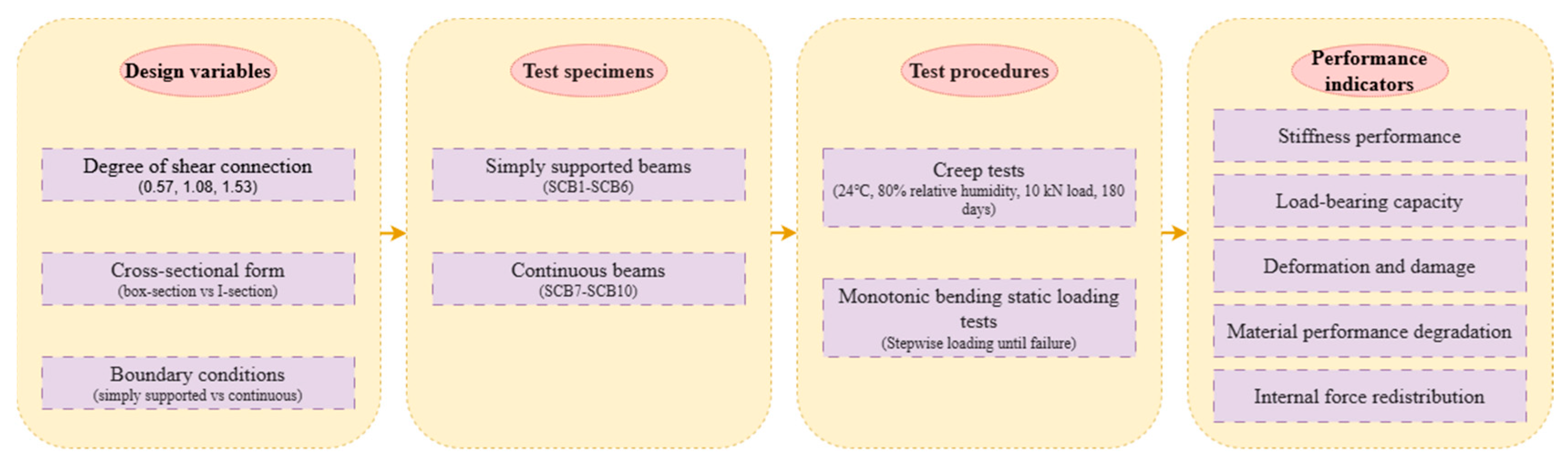 - Cross-Sectional Form: Due to their better torsional restraint, box-sections exhibited 10~15% lower creep deflections than I-sections, but their influence on ultimate load-bearing capacity and stiffness was much smaller than that of the shear connection degree.