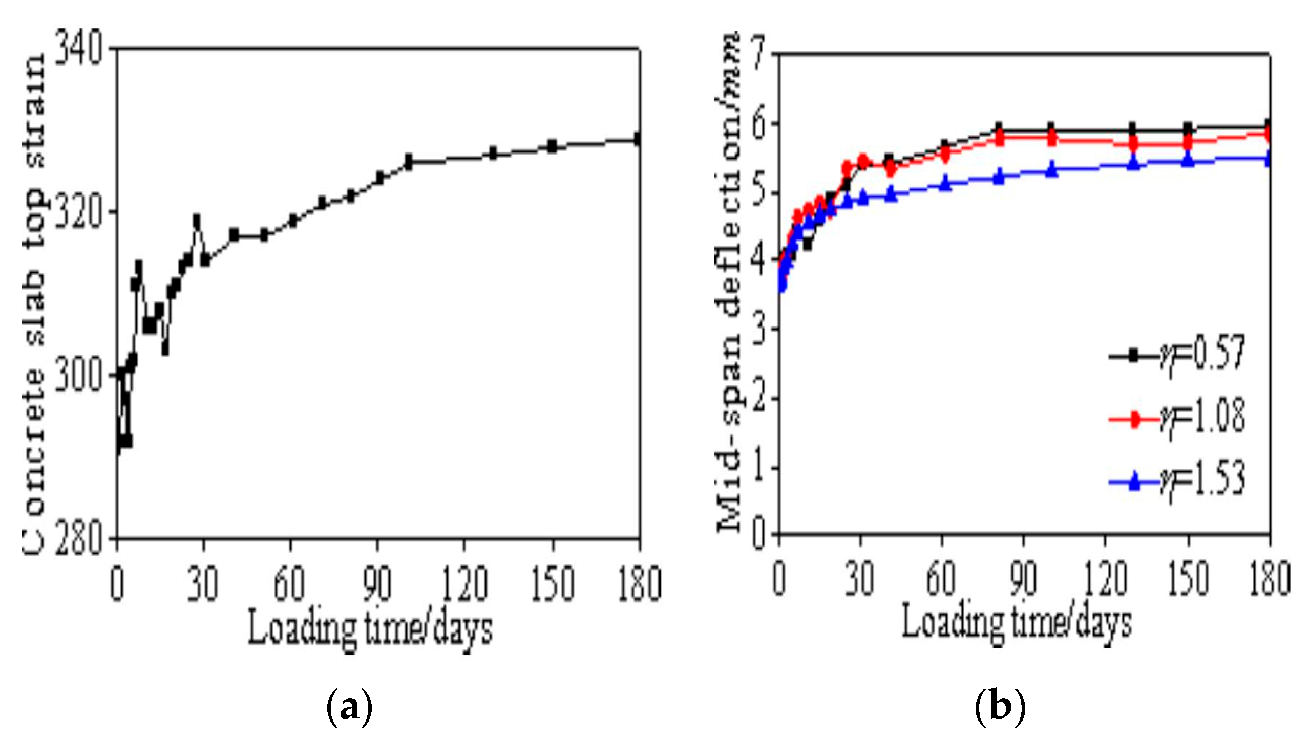 - Quantitative law of creep-induced stiffness degradation in composite beams: This study quantifies for the first time that “the overall stiffness decreases by approximately 10% after 180 days of creep” and clarifies the quantitative relationship that “for every 0.5 increase in shear connection degree, the stiffness degradation rate can be reduced by 8–10%”. This provides key experimental data support for the development of more accurate long-term performance prediction models for composite materials.