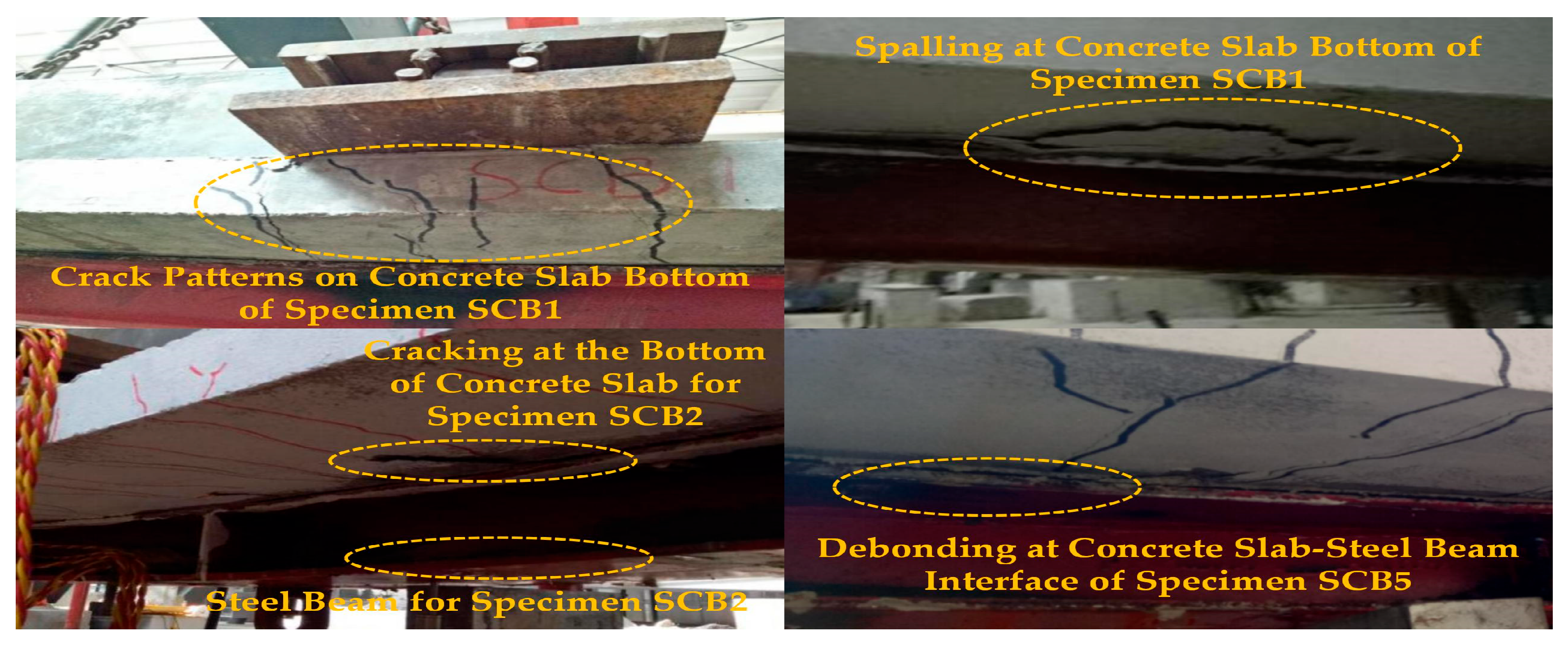 - A general trend was that the measured deflections of all specimens in the elastic stage were smaller than the code-calculated values (Table 6). This suggests that current design codes may underestimate the actual stiffness of composite beams, as they do not fully account for the “tension stiffening effect” of cracked concrete.