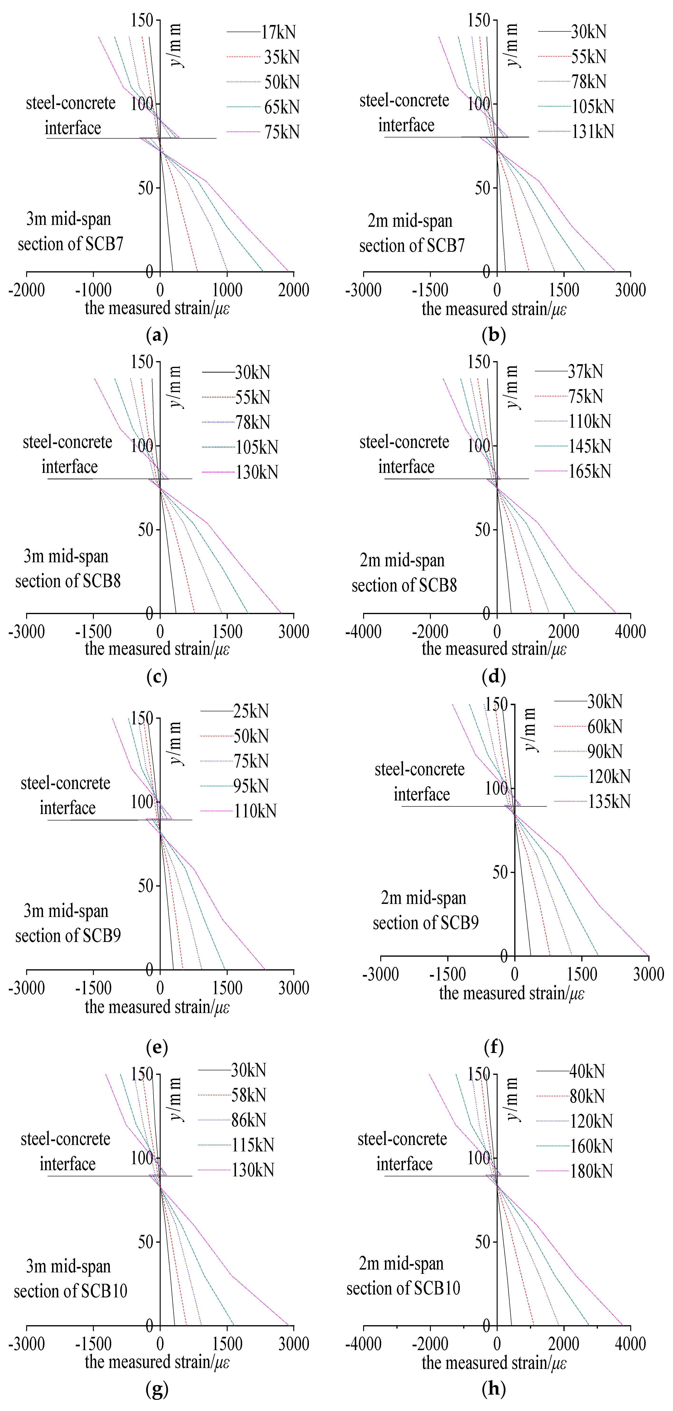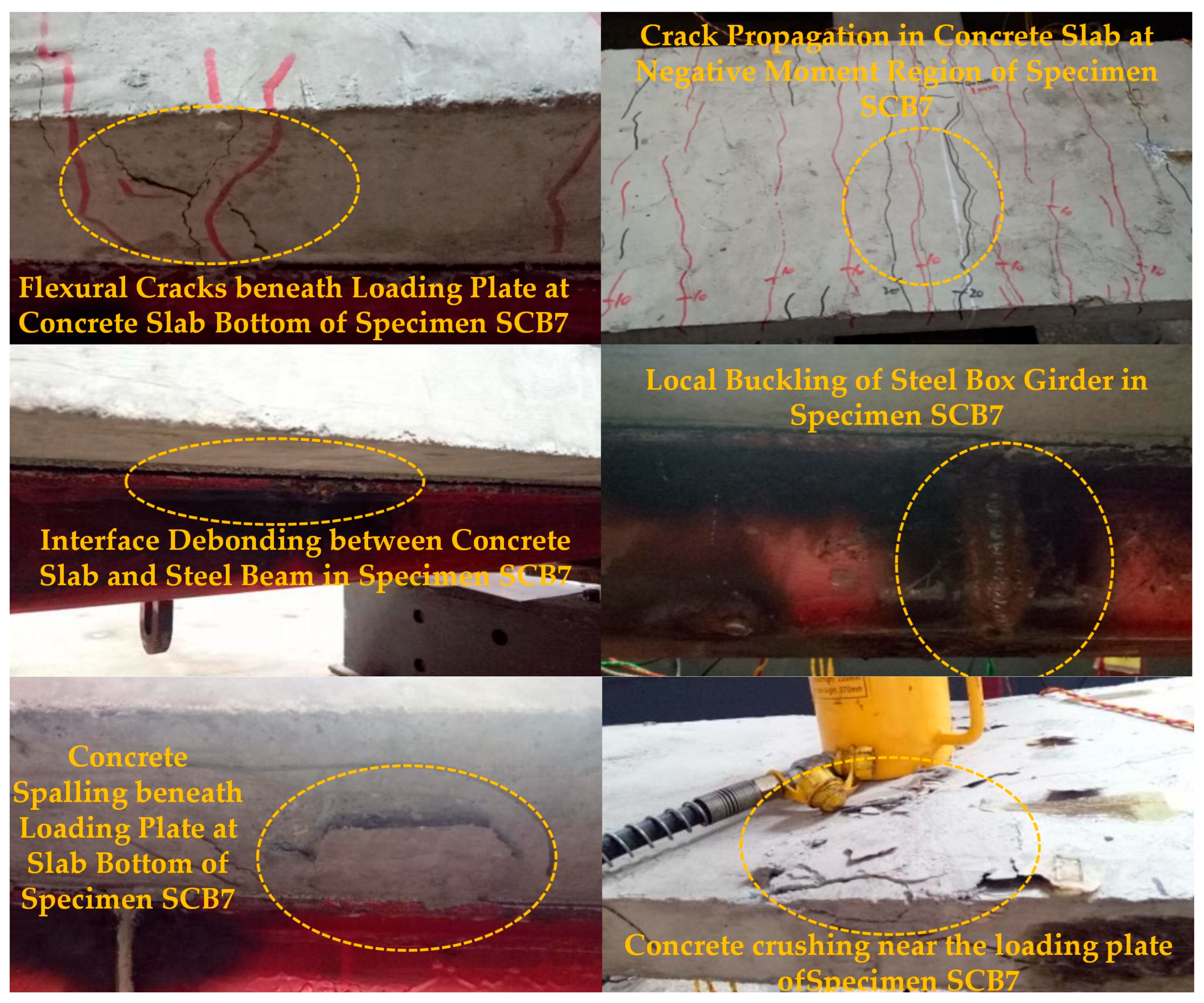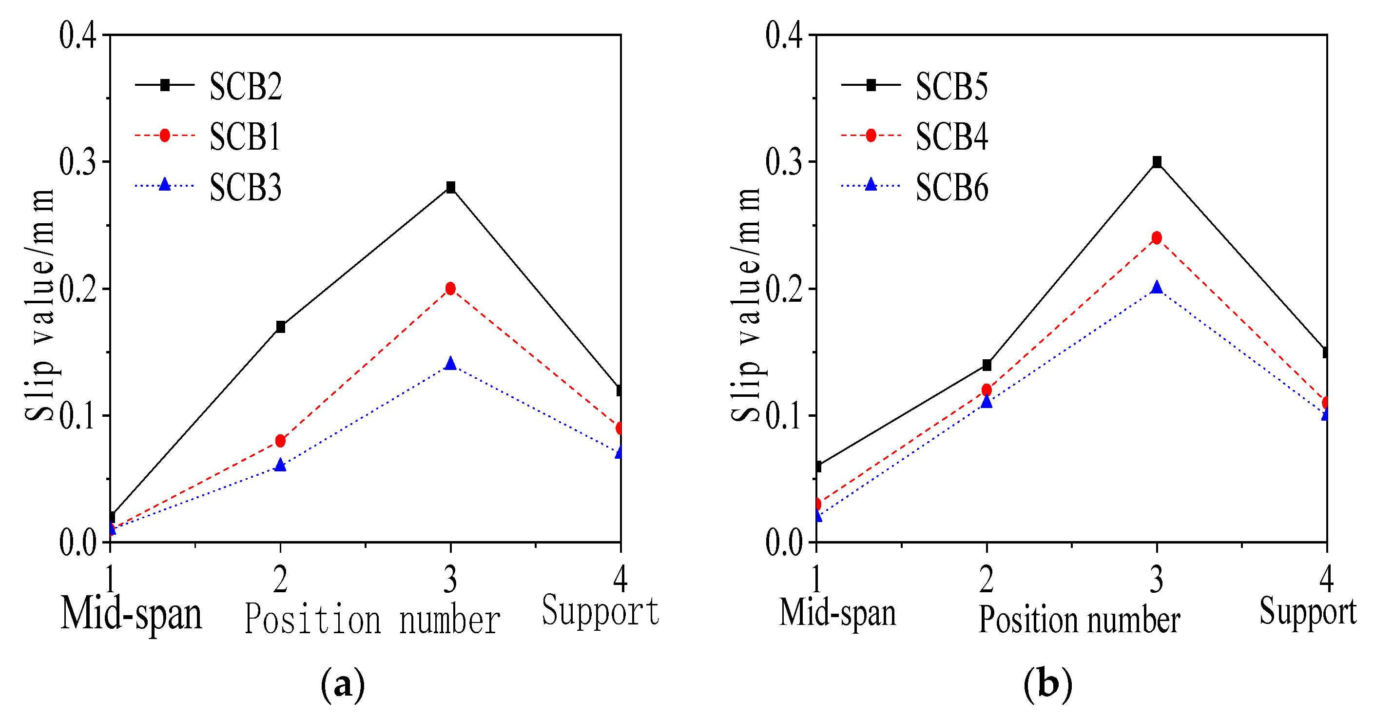- The measured load-bearing capacity of the partially shear-connected specimen SCB7 was slightly lower than the theoretical value (approximately 93~95% of theoretical). This is likely because its interface slip occurred earlier, limiting the full development of composite action.