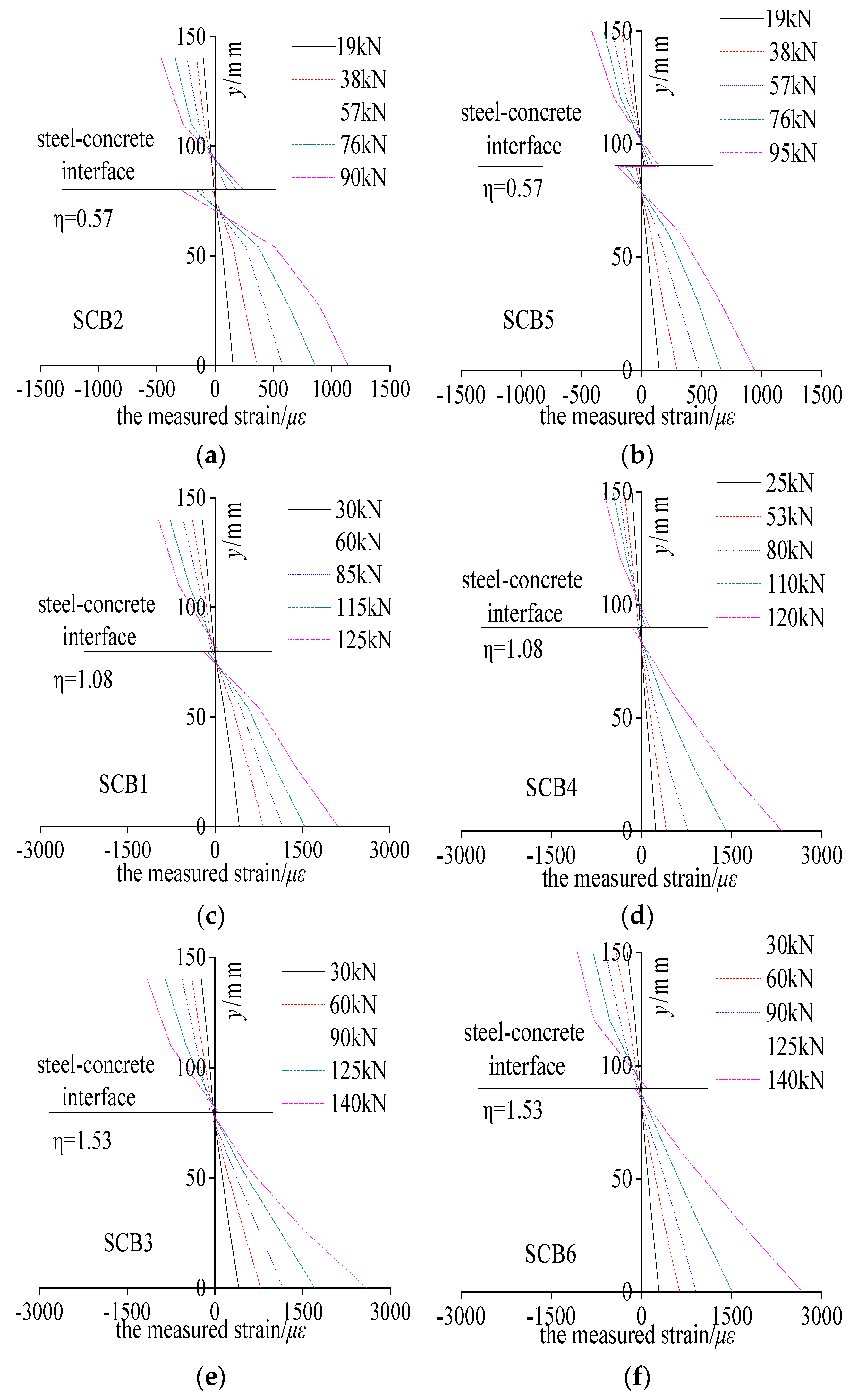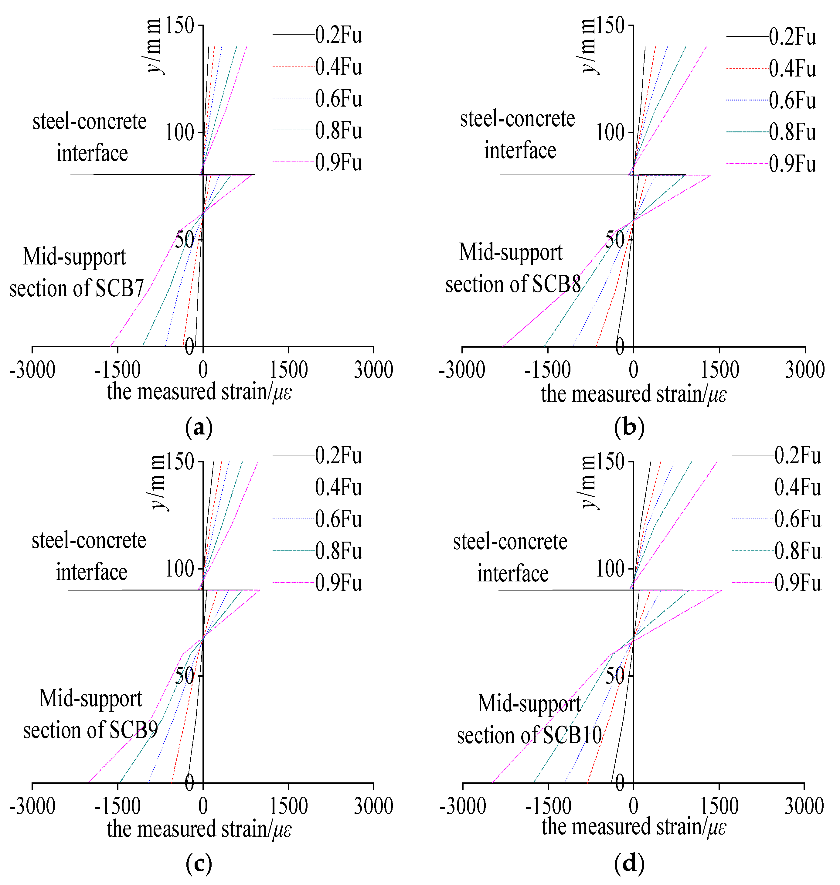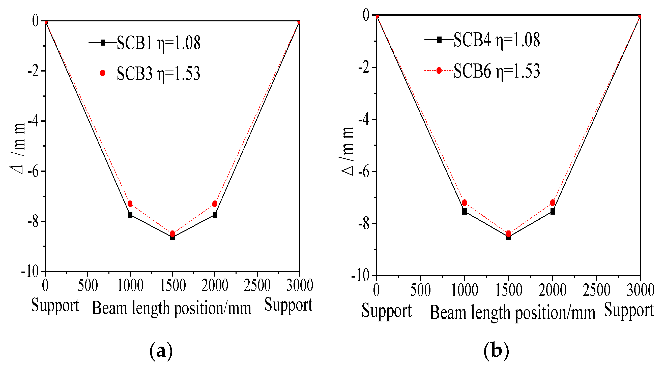 - The measured load-bearing capacity of the partially shear-connected specimen SCB7 was slightly lower than the theoretical value (approximately 93~95% of theoretical). This is likely because its interface slip occurred earlier, limiting the full development of composite action.