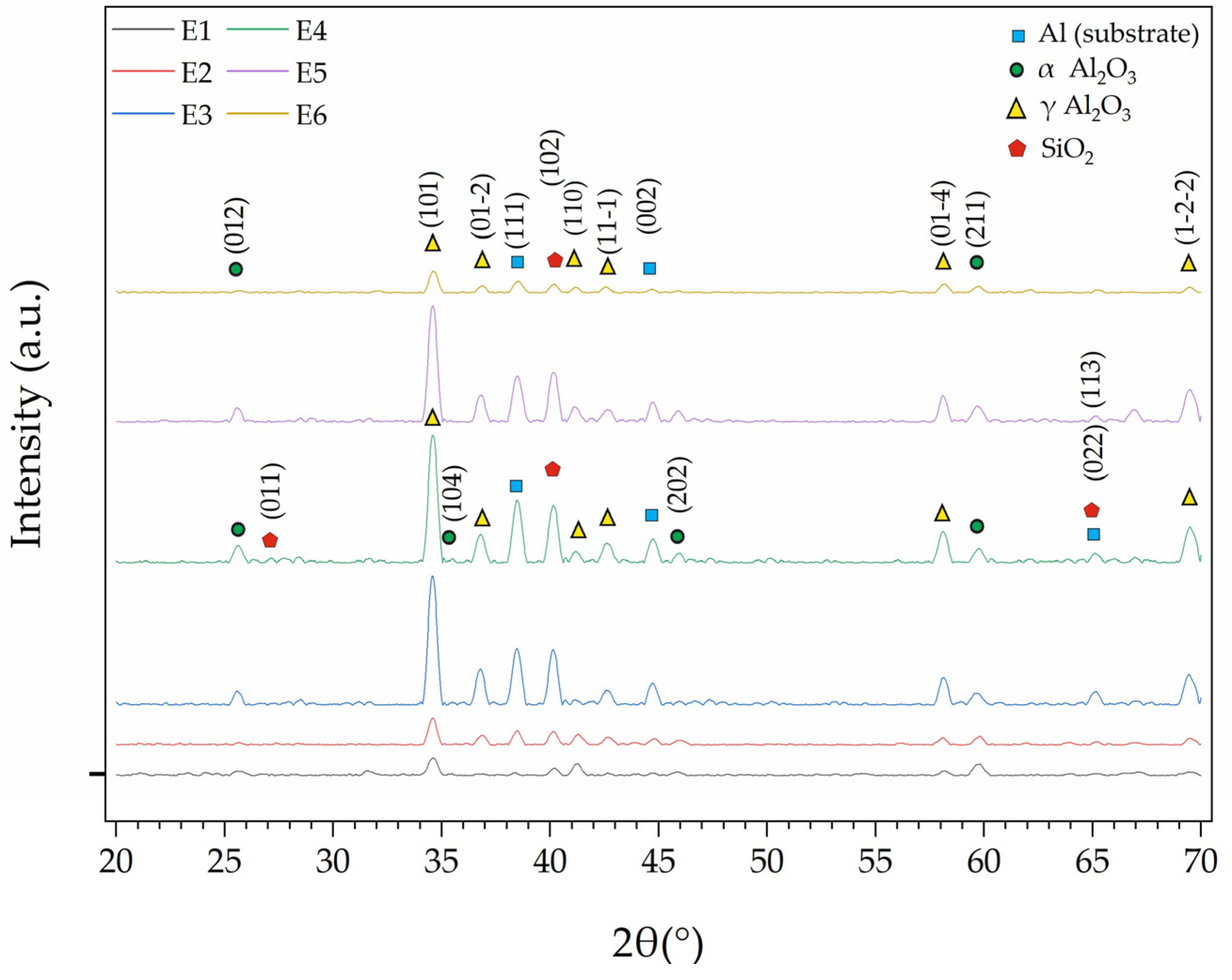 - Dehnavi, V.; Liu, X.Y.; Luan, B.L.; Shoesmith, D.W.; Rohani, S. Phase Transformation in Plasma Electrolytic Oxidation Coatings on 6061 Aluminum Alloy. Surf Coat Technol 2014, 251, 106–114. [Google Scholar] [CrossRef]