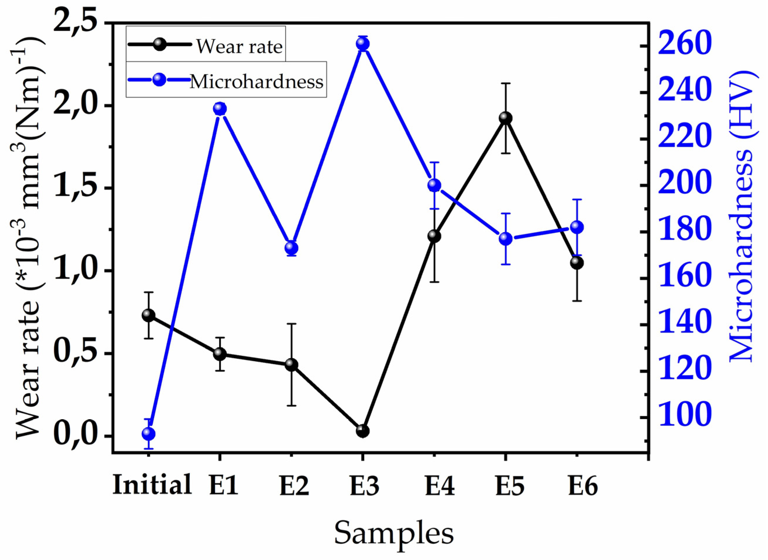 - Coatings E1 and E2 exhibited improved wear resistance compared to the initial sample (η_wear = +32% and +41%), and their microhardness increased to 230 HV(E1) and 173 HV (E2). This contributed to the reduction in the wear rate of these coatings. In particular, sample E2 showed a slightly improved surface morphology, with finer and more uniformly distributed pores.