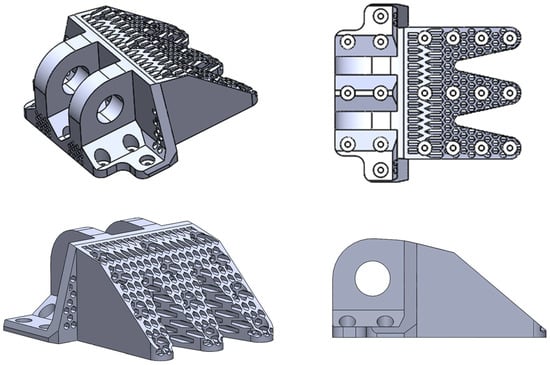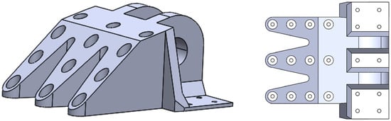 Based on the optimization results (Figure 3), the topology-optimized DLJS is geometrically reconstructed using the 3D modeling software SolidWorks 2022 []. As shown in Figure 4, the non-critical load-bearing material around the three bolt holes far from the lugs is removed, achieving a preliminary lightweight design with a mass of 36.23 kg. The material layout around the lugs is preserved, while the bolt hole region is redesigned with regular-shaped features based on the TO results for Case 1 (Figure 3a).