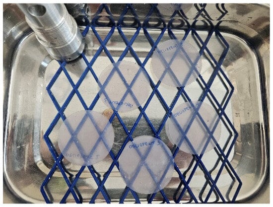 The test specimens were discs with a diameter of 50 ± 1 mm and a thickness of 0.5 ± 0.1 mm, with plane-parallel top and bottom surfaces. For digitally fabricated test specimens, an STL file was prepared, and all processing and post-processing procedures were performed according to the manufacturer’s instructions. An Asiga Max UV (Asiga Europe, Erfurt, Germany) DLP 3D printer was used, with a 62 µm resolution and a 385 nm curing wavelength. The Asiga Flash Cure Box (Asiga Europe, Erfurt, Germany) was used for post-curing for 20 min. For the production of Meliodent Heat Cure test samples, a stainless steel template was prepared and the compression moulding technique with heat curing was performed according to the manufacturer’s instructions. For each material, five test specimens were prepared, making a total of 30.