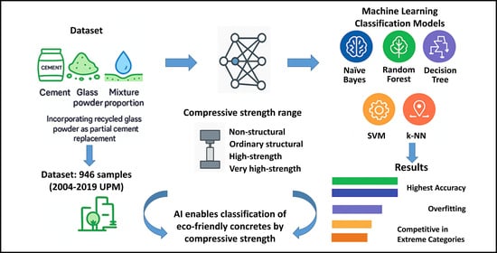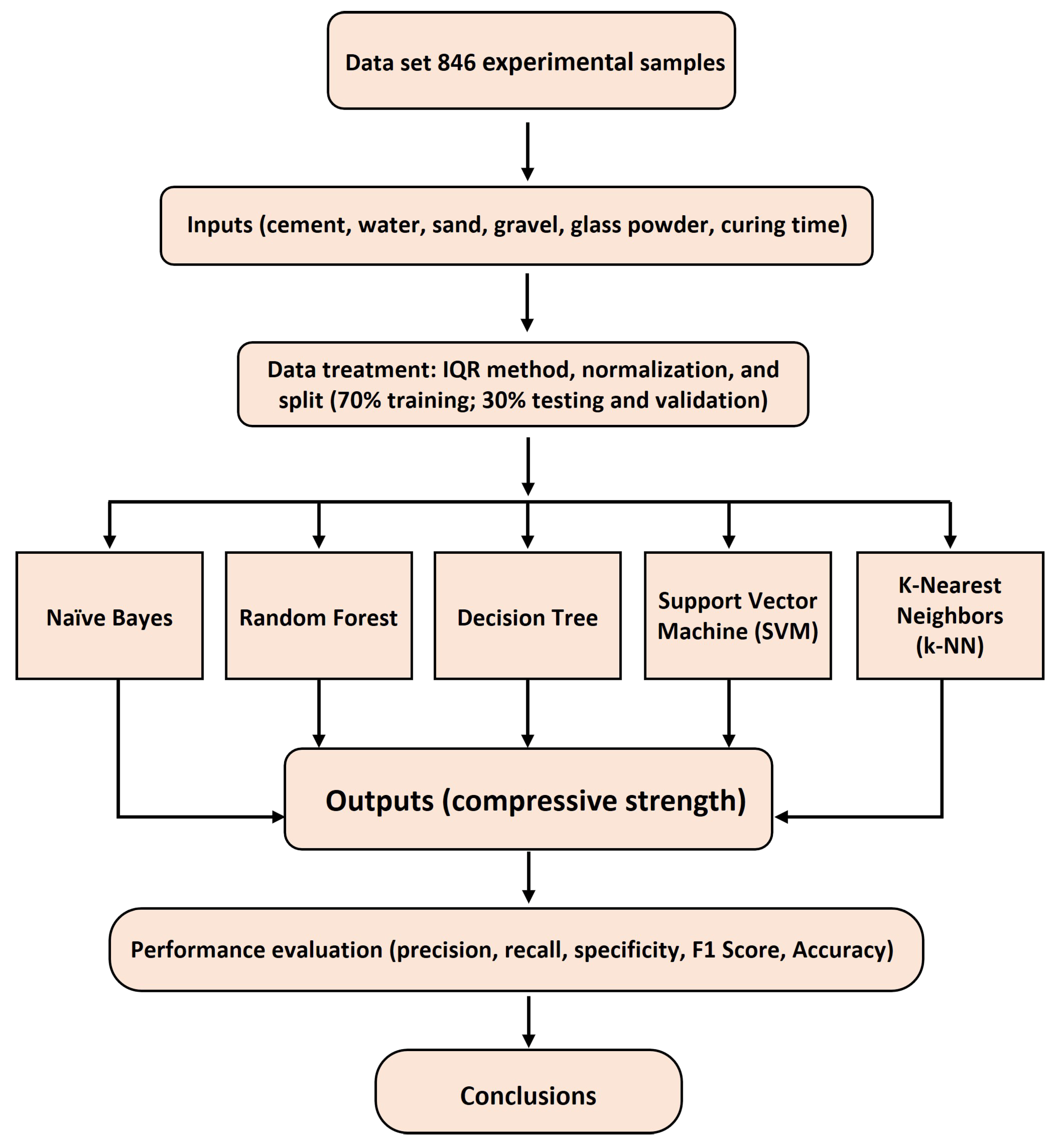 22], followed by destructive laboratory testing to determine compressive strength, which entails a significant cost in terms of time, materials, and labor. In this context, artificial intelligence (AI) and machine learning (ML) models offer a non-destructive and efficient approach for predicting and classifying compressive strength, particularly in eco-friendly concretes with partial cement replacement using non-recyclable glass powder. This represents a significant step toward digitalization and sustainability in the construction sector.