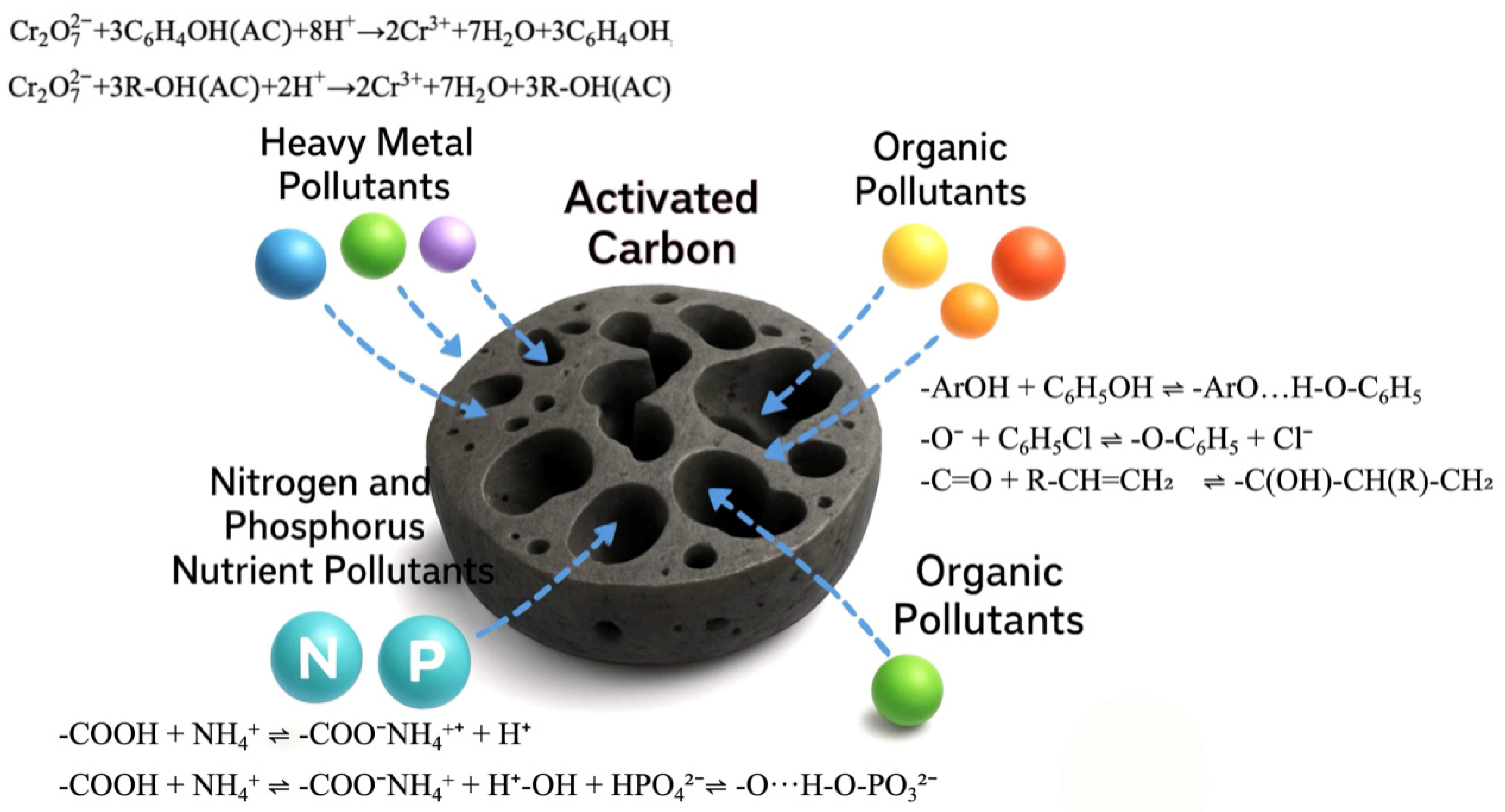 | Reduction modification | Some oxygen-containing groups were removed by the reaction of the reducing agent with oxygen-containing functional groups on the surface of activated carbon, or reducing functional groups, such as amino (-NH2), were introduced to adjust the surface charge properties. | Enhance the adsorption and reduction ability of oxidizing pollutants (such as Cr6+ and NO3−), and improve the adsorption selectivity of non-polar substances. |