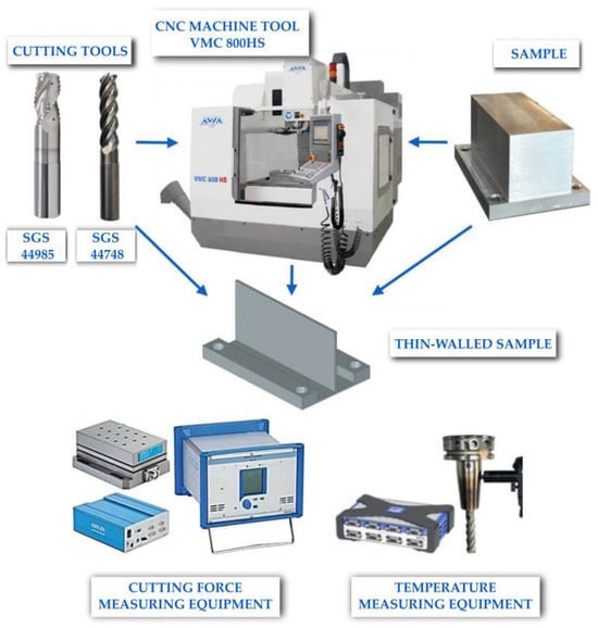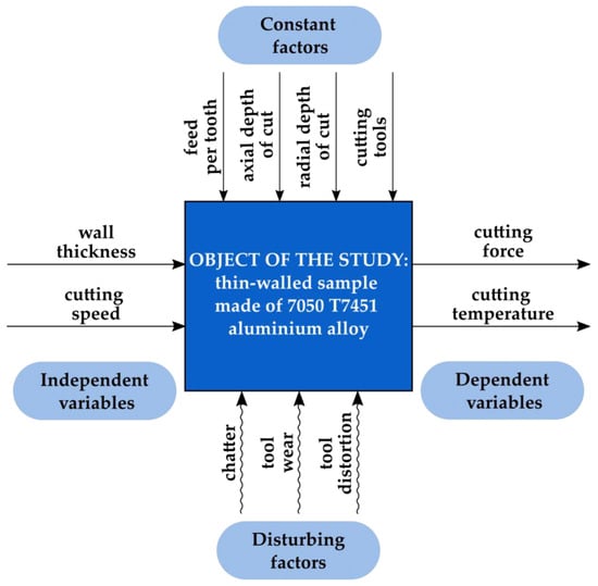 Figure 1 shows the design of the experiment. A thin-walled sample with variable wall thickness, made of aluminium alloy 7050 T7451, was the object of the study. Experimental independent variables were thin wall thickness and cutting speed. Dependent variables related to thermomechanical interactions in the milling process were cutting force and cutting temperature. Constant factors included other technological parameters (feed per tooth, axial depth of cut, and radial depth of cut (milling width)), as well as cutting tools. Disturbing factors were chatter, tool wear, and tool deflection.