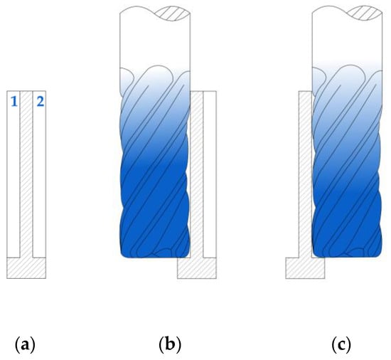 Finish milling of a thin wall at a maximized axial depth of cut: (a) wall before finishing, tool passes are denoted by 1 and 2; (b) first pass of the tool; (c) second pass of the tool.
