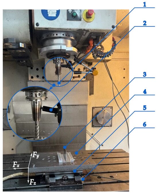 Stand for measuring cutting force components and cutting temperature (CNC machine tool workspace): 1—cutting tool (first junction of a natural thermocouple), 2—graphite brush, 3—workpiece (second junction of a natural thermocouple), 4—mounting plate, 5—dynamometer, 6—copper washer.