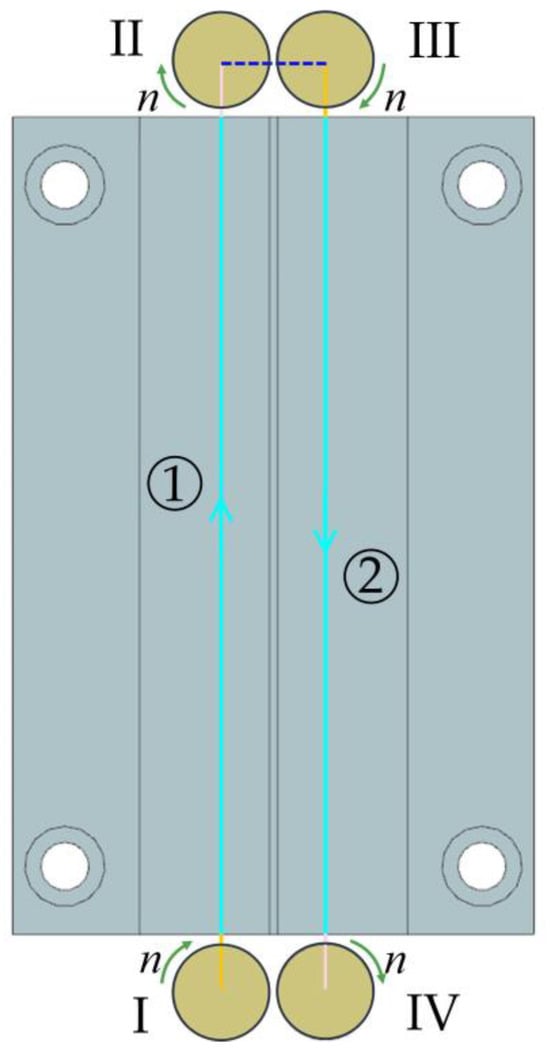The machining operation was performed in two concurrent tool passes, denoted by numbers 1 and 2, respectively. Firstly, the tool made the first pass along the surface of the wall on the left side, in accordance with the assumed feed direction (marked with a blue arrow), starting from Point I, i.e., the tool entry into the material, until reaching Point II, marking the tool exit from the material after completing the first pass. After that, the tool made a second pass on the opposite side of the wall (on the right), in the reverse direction to the first pass (in accordance with the feed direction). Here, Point III marks the entry of the tool into the material during the second pass, while Point IV marks the moment when the tool exits the material after completing the machining. Green arrows indicate the direction of tool rotation.