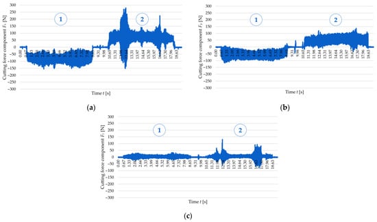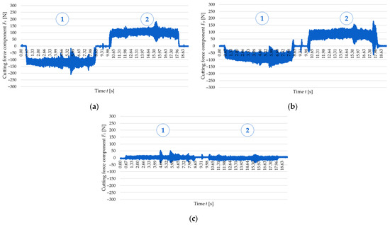 Variations in the cutting force components for a cutting speed of vc = 300 m/min and a wall thickness of t = 1 mm: (a) Fx; (b) Fy; (c) Fz: 1—first tool pass, 2—second tool pass.