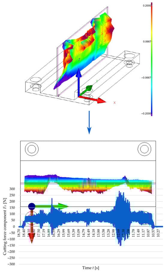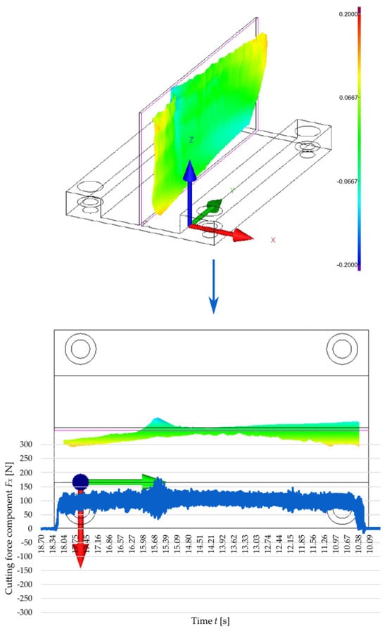 Correlation between the cutting force component Fx during the second pass of the end mill at a cutting speed of vc = 300 m/min and a 3D visualisation of the flatness deviation in a thin wall with a thickness of t = 2 mm.