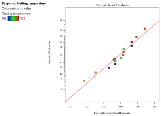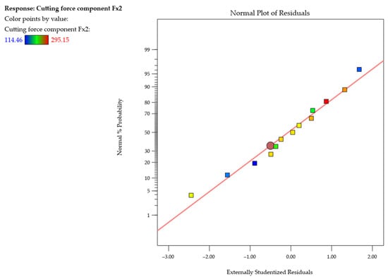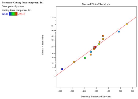 Since one of the key conditions for regression model accuracy is the assumption of normal distribution of residuals, Figure 10 presents the normal probability plot of studentized residuals for the cutting force component Fx1 during the first pass of the cutting tool. An analysis of the plot shows that the points are distributed along a red straight line representing an ideal normal distribution. This arrangement indicates that the model residuals are symmetrically distributed around zero and that there are no significant deviations from the normal distribution. In particular, the lack of characteristic curvatures or clusters of points outside the reference line confirms that the model does not require transforming the response variable and that there are no outliers that could distort the analysis results. The normal probability plot of residuals thus confirms that the developed quadratic model of Fx1 meets the assumption of the normality of residuals and can therefore be considered statistically correct and adequate for describing the cutting process under study.