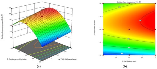 Cutting force component Fx1 in the first pass of the cutting tool as a function of the wall thickness and cutting speed: (a) response surface plot; (b) contour plot.