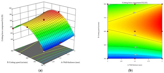 Relationships between the cutting force component Fx2 during the second pass of the cutting tool and the wall thickness and cutting speed are shown in Figure 13 as response surface (Figure 13a) and contour (Figure 13b) plots, demonstrating that the values of the cutting force component Fx2 increase with wall thickness. The lowest values of the cutting force component Fx2 were observed for a wall thickness of t = 1 mm, while the highest values were obtained for t = 2 mm. The same correlation between cutting speed and the cutting force component Fx2 was observed for each tested wall thickness. A cutting speed increase causes an increase in the cutting force component Fx2 until it reaches the maximum value at a cutting speed of approximately vc ≈ 700 m/min, but a further increase in the cutting speed causes the cutting force component Fx2 to decrease. Importantly, the values of the cutting force component Fx2 at vc = 900 m/min are still higher than those observed at vc = 300 m/min. Concluding, the highest values of the cutting force component Fx2 were obtained for a combination of the thickest wall t = 2 mm and a cutting speed of approximately vc ≈ 700 m/min, while the lowest values were obtained for the thinnest wall t = 1 mm and the lowest cutting speed vc = 300 m/min. Furthermore, it should be emphasised that differences were found between the maximum values of the cutting force components Fx1 and Fx2 in two passes of the cutting tool. During the second pass of the end mill, the cutting force component Fx2 was lower (in relation to Fx1).