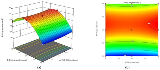 Cutting temperature T as a function of wall thickness and cutting speed: (a) response surface plot; (b) contour plot.