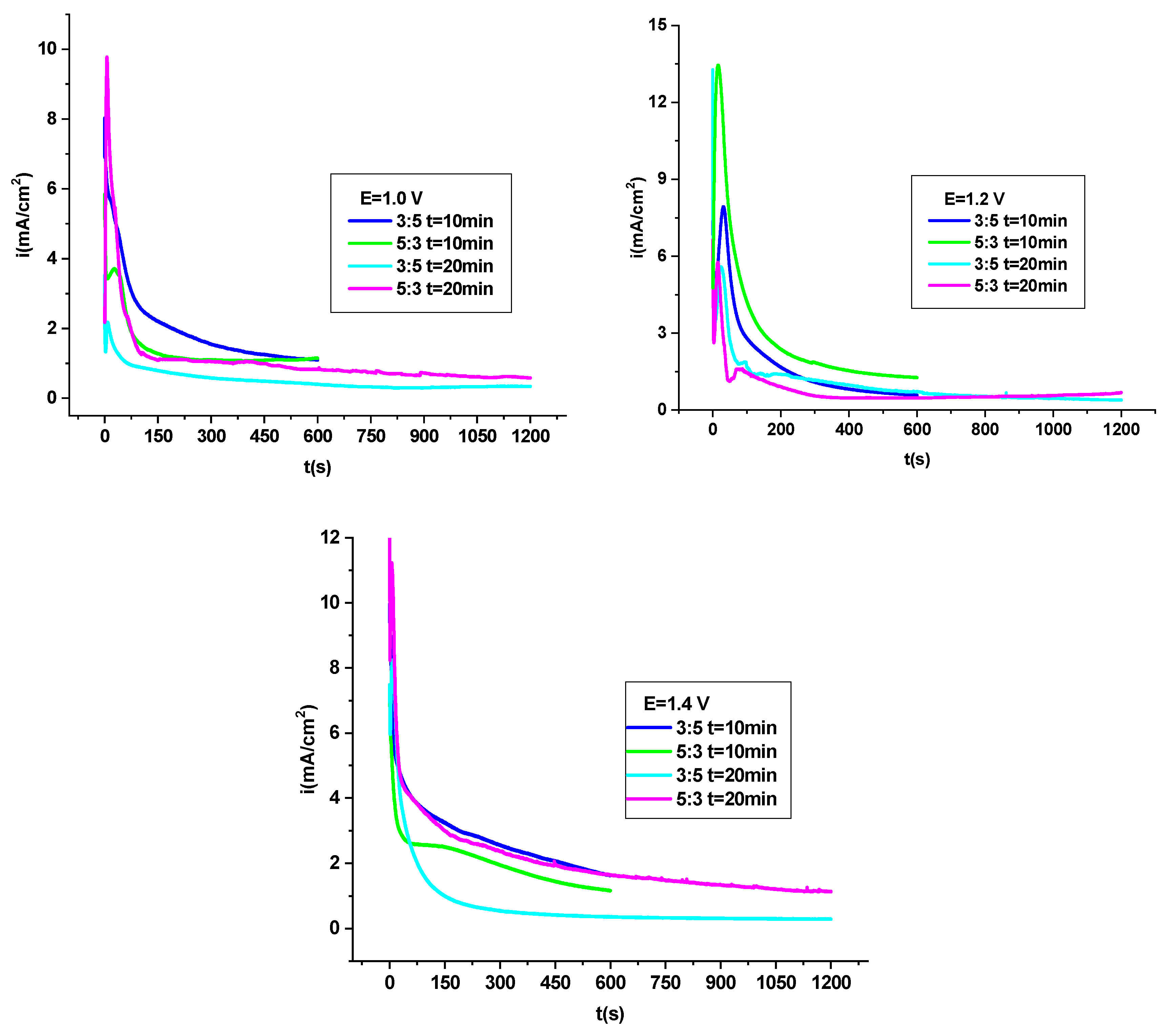| P3MPY–AOT/P3MTP 1.2 V 3:5 molar ratio, t = 10 min | 2.28 | 0.000266 | 0.76 | 12 | 0.000674 | 0.77 | 38 | 4.024 × 10−4 |
