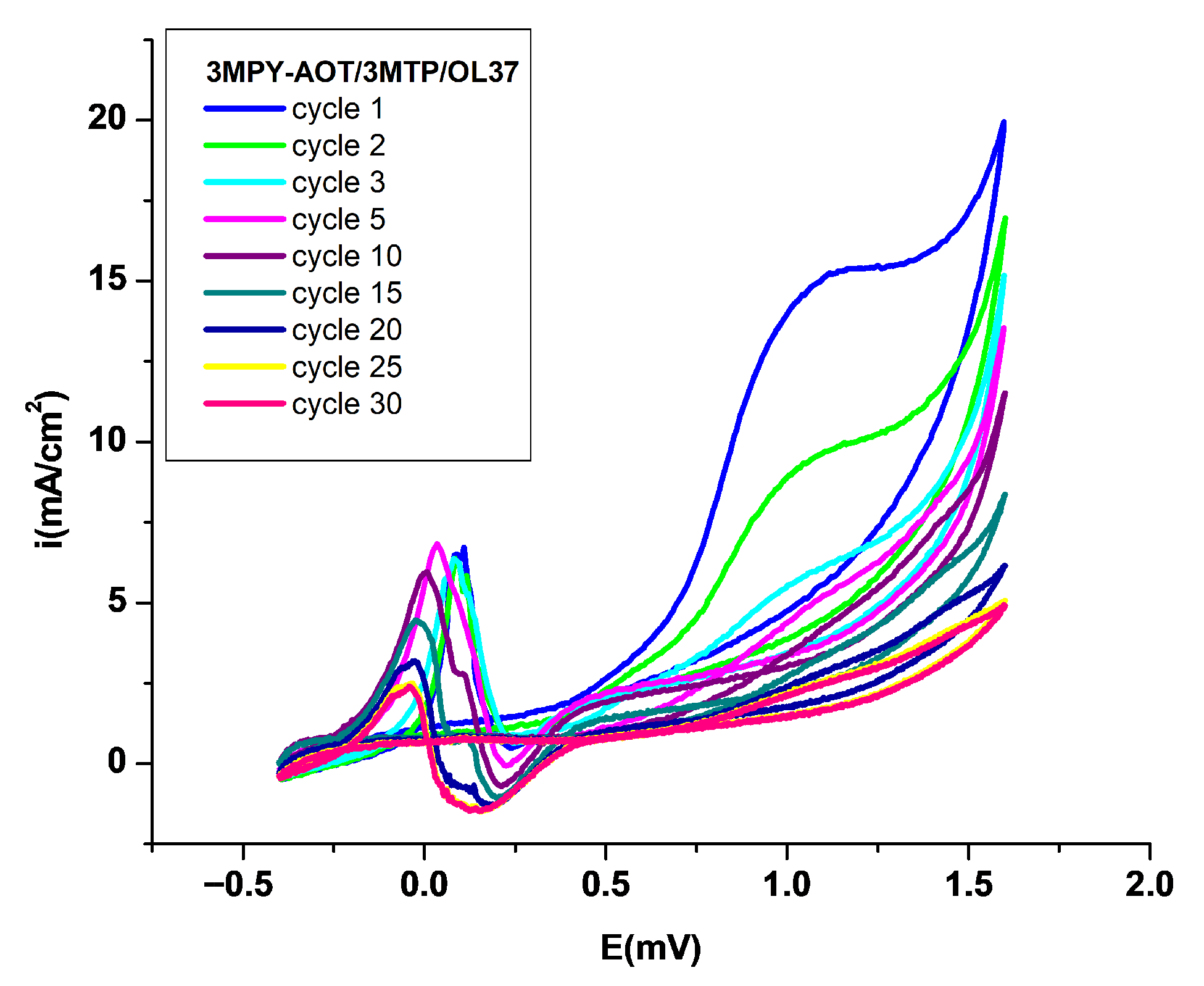 3.1. Electrodeposition of P3MPY–AOT/P3MTP/OL 37