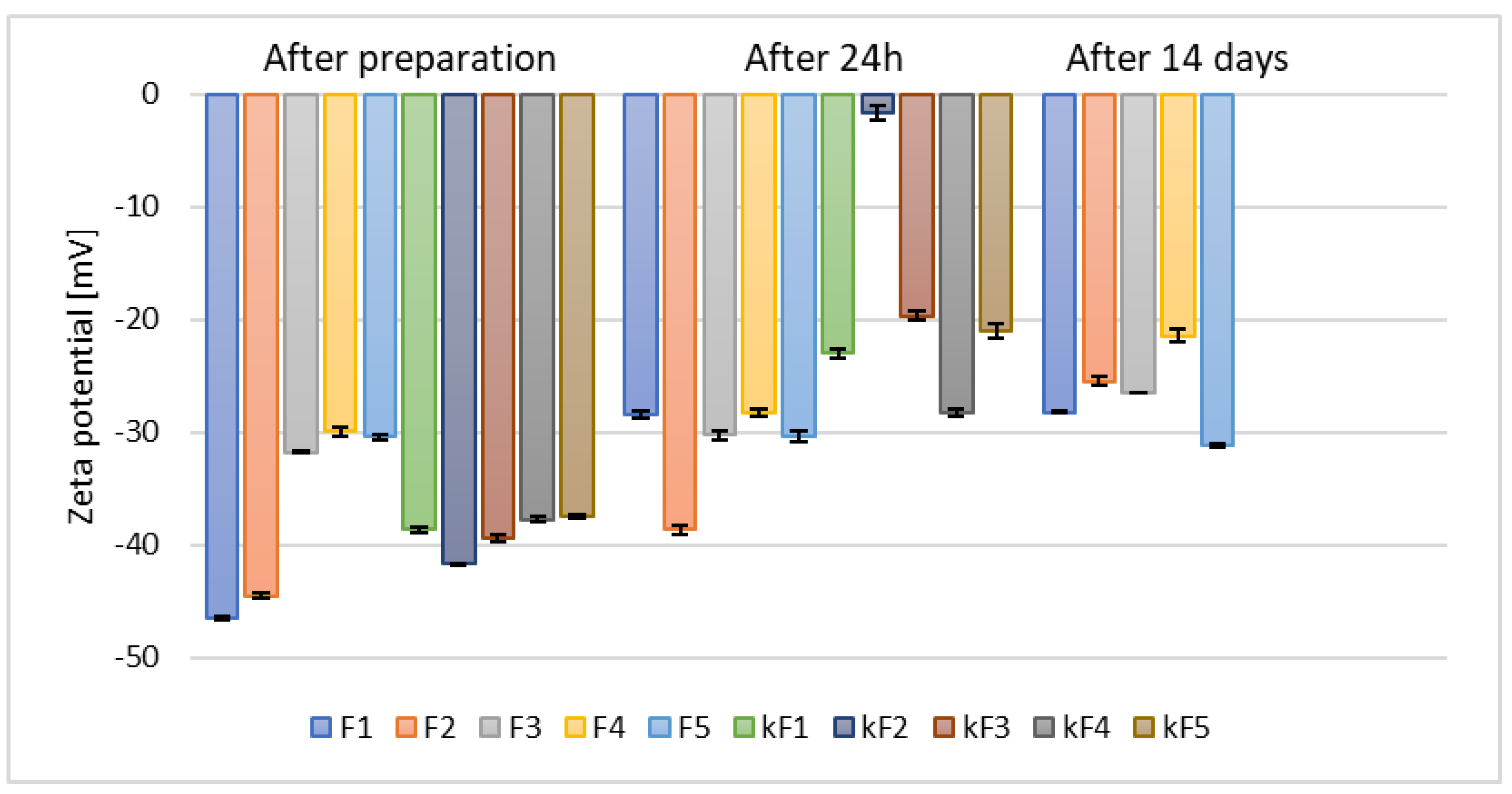| Formulation | Zeta Potential [mV] | ±SD [mV] | Zeta Potential [mV] | ±SD [mV] | Zeta Potential [mV] | ±SD [mV] |
