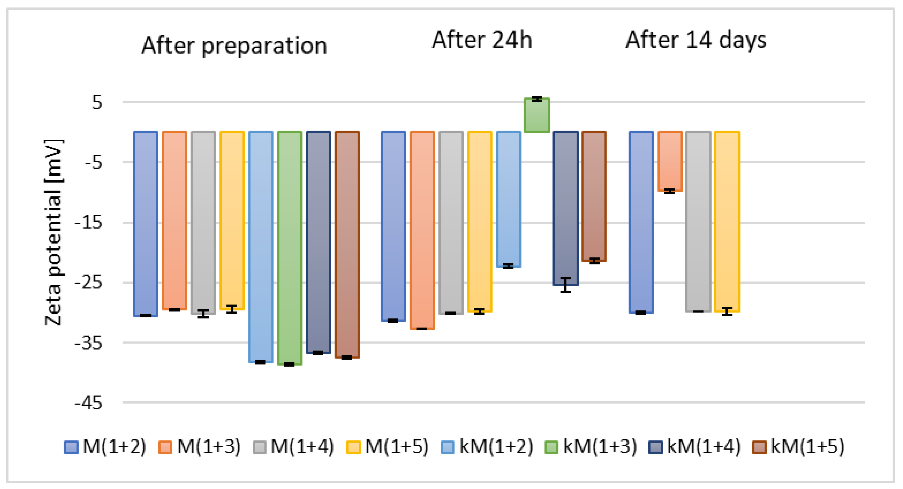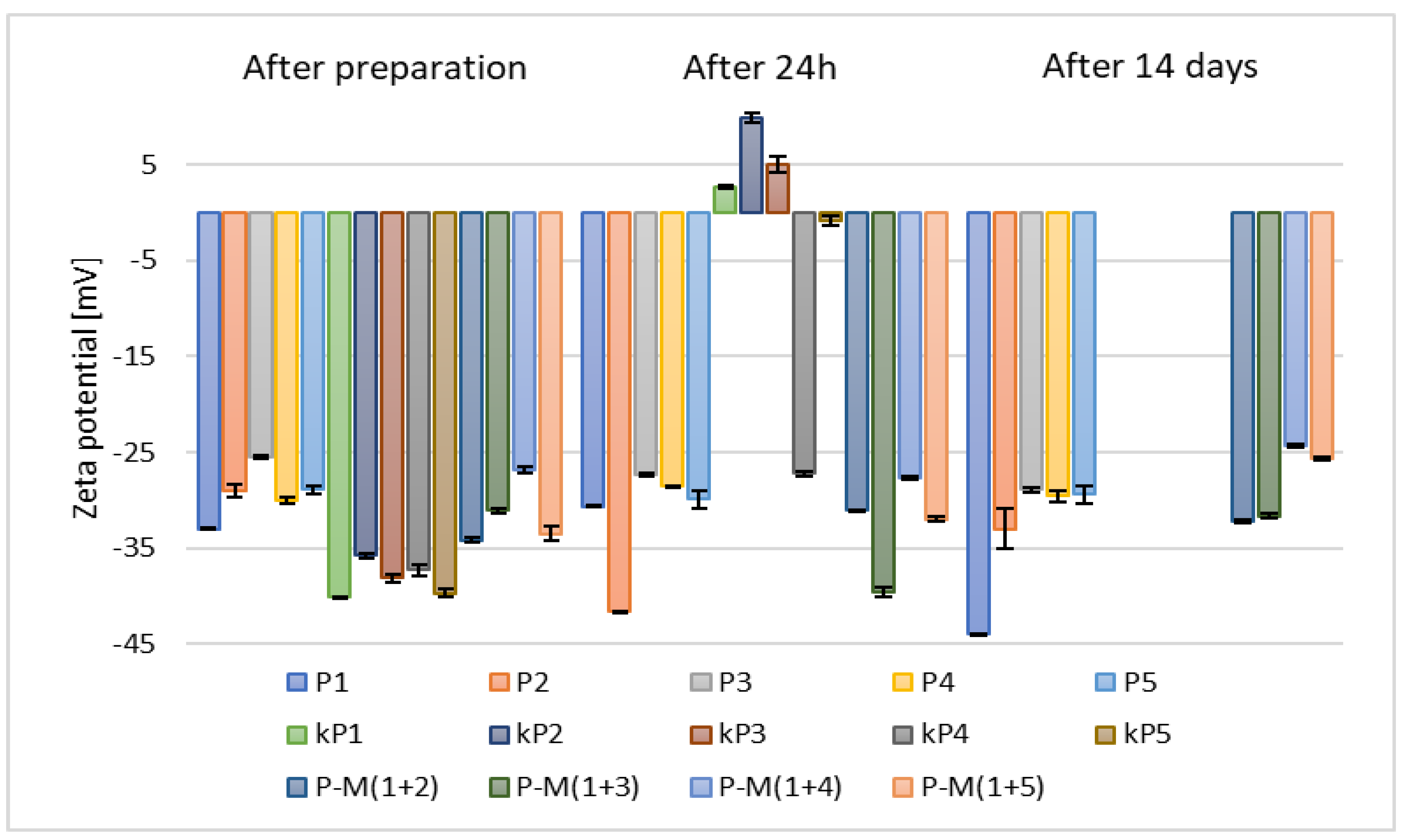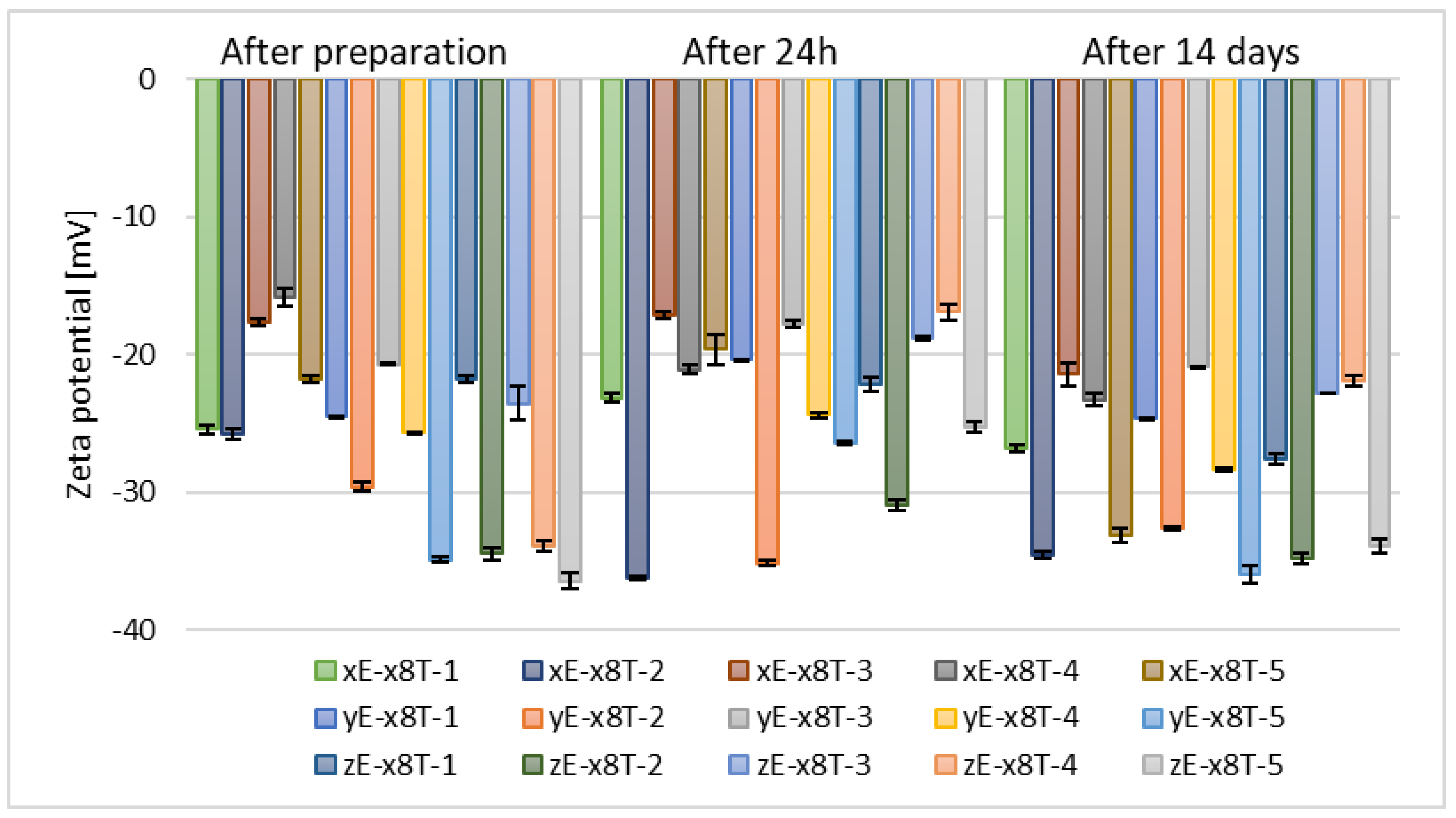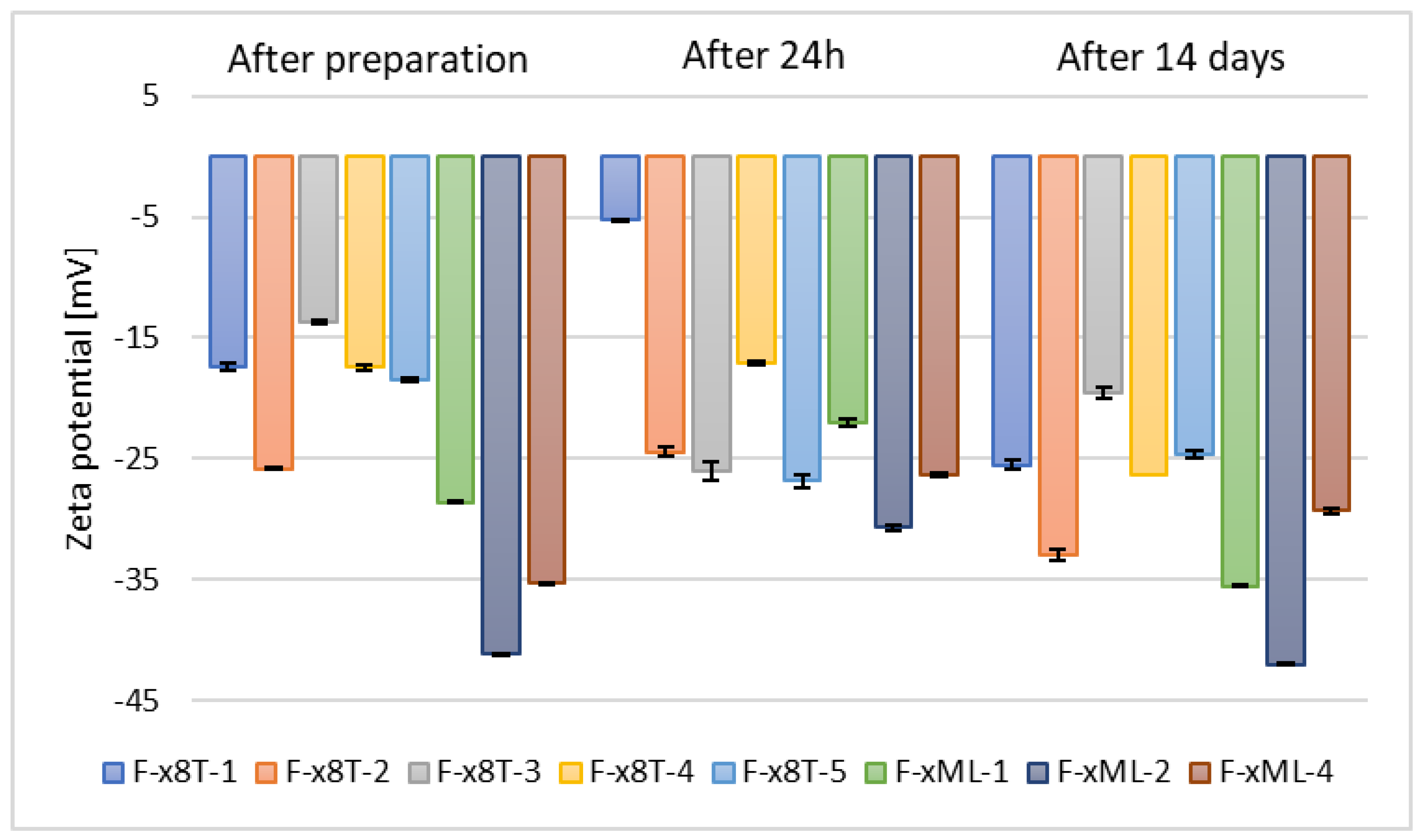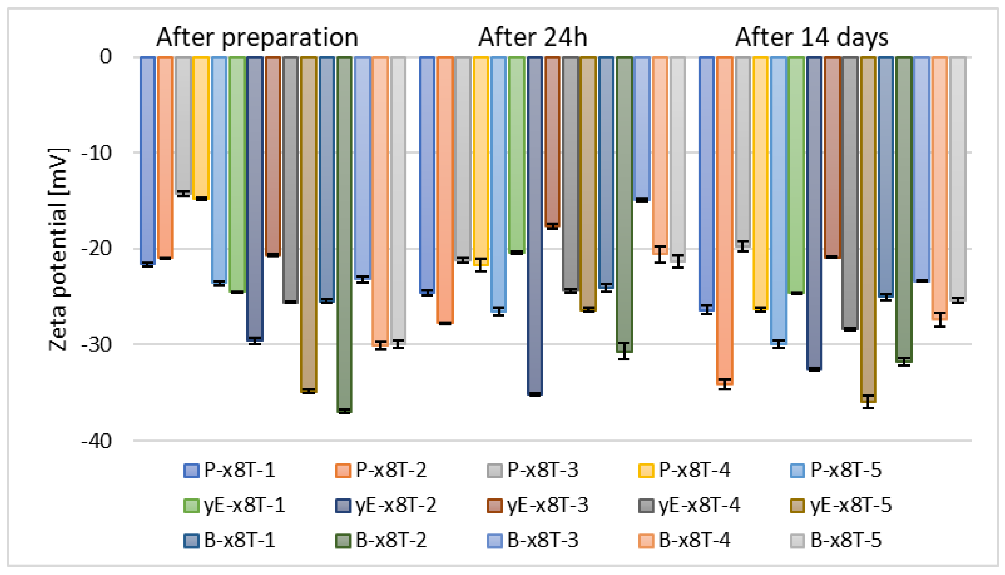 | zeta potential (ZP) | Approx. −5–(−)40 mV | Approx. −30–(−)60 mV | >(−)30 mV |