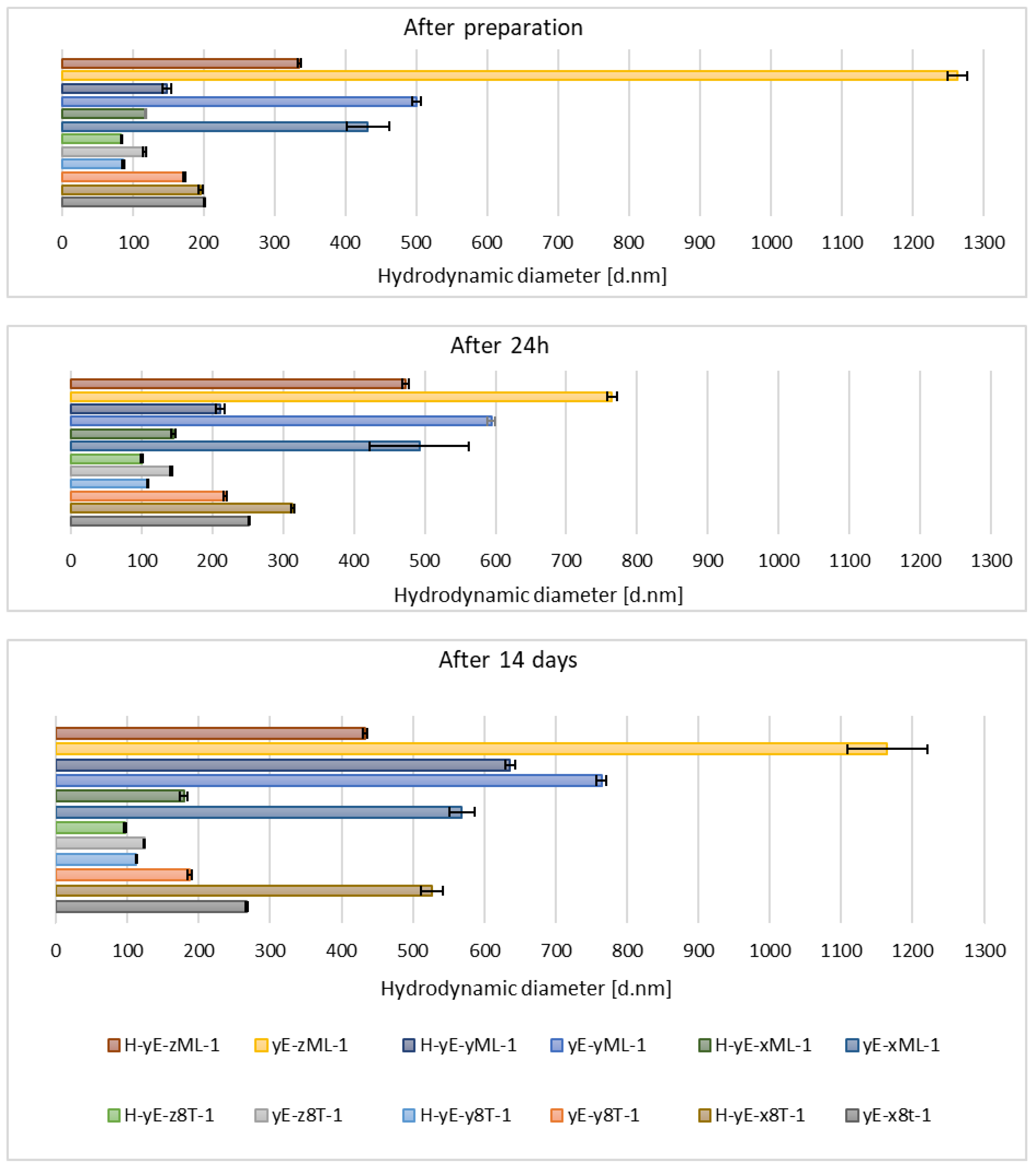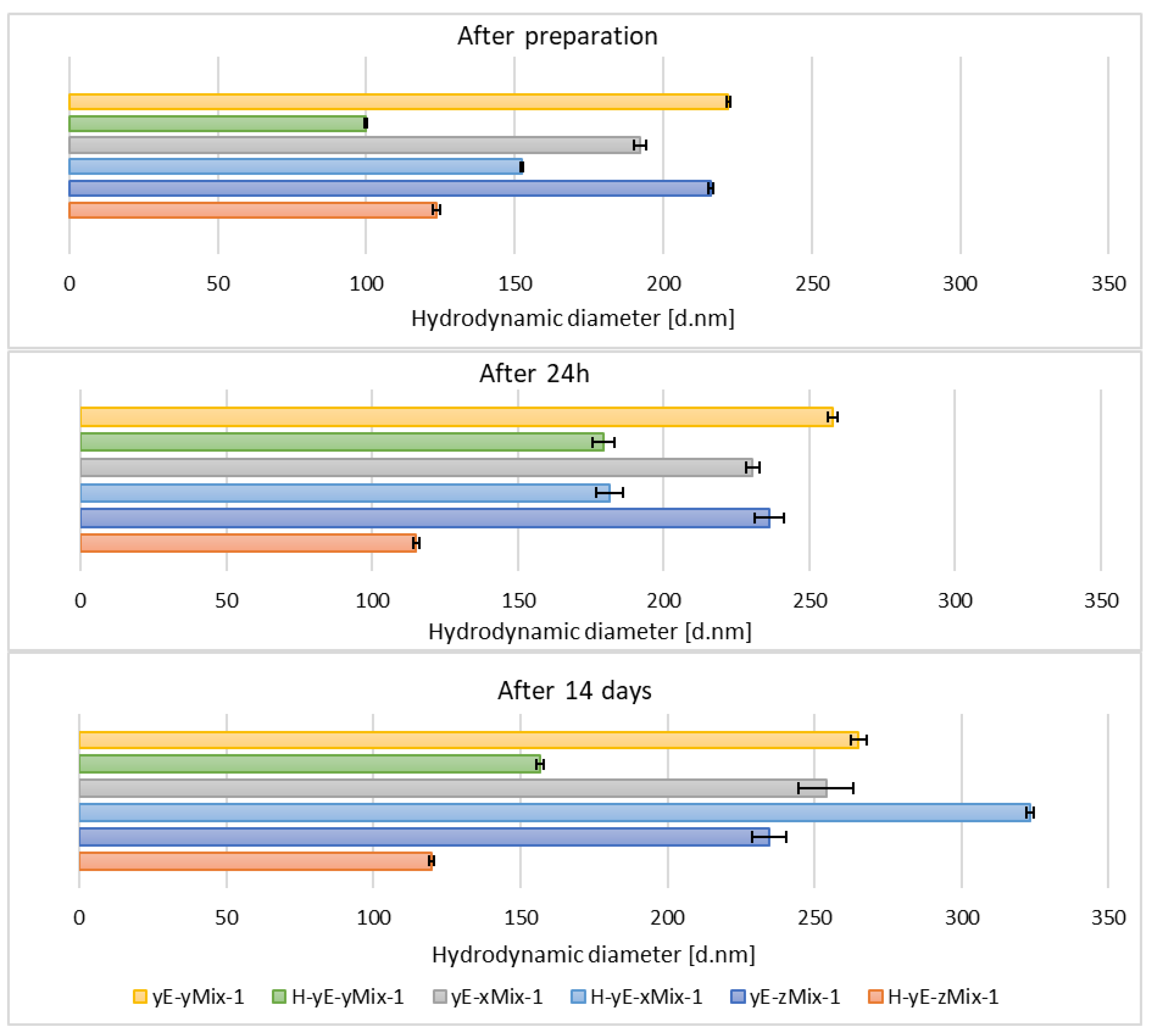 - H-yE-xMix-1 denotes a sample prepared with the following composition: 10% (w/w) of ethylene glycol, 0.625% (w/w) of surfactant mixture, 30% (w/w) of ethanol and 2.5% (w/w) of phospholipid, the preparation method used was homogenization.