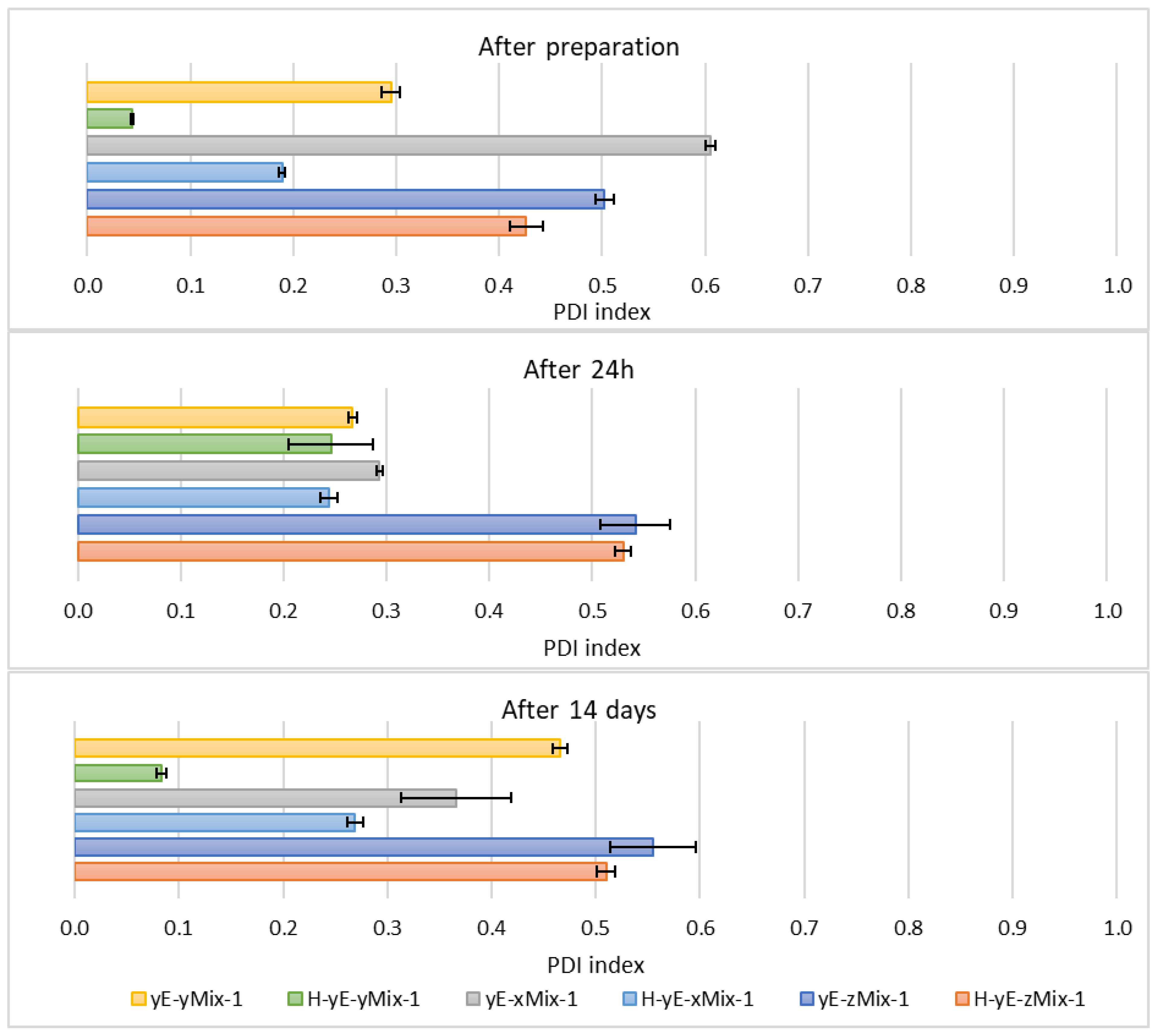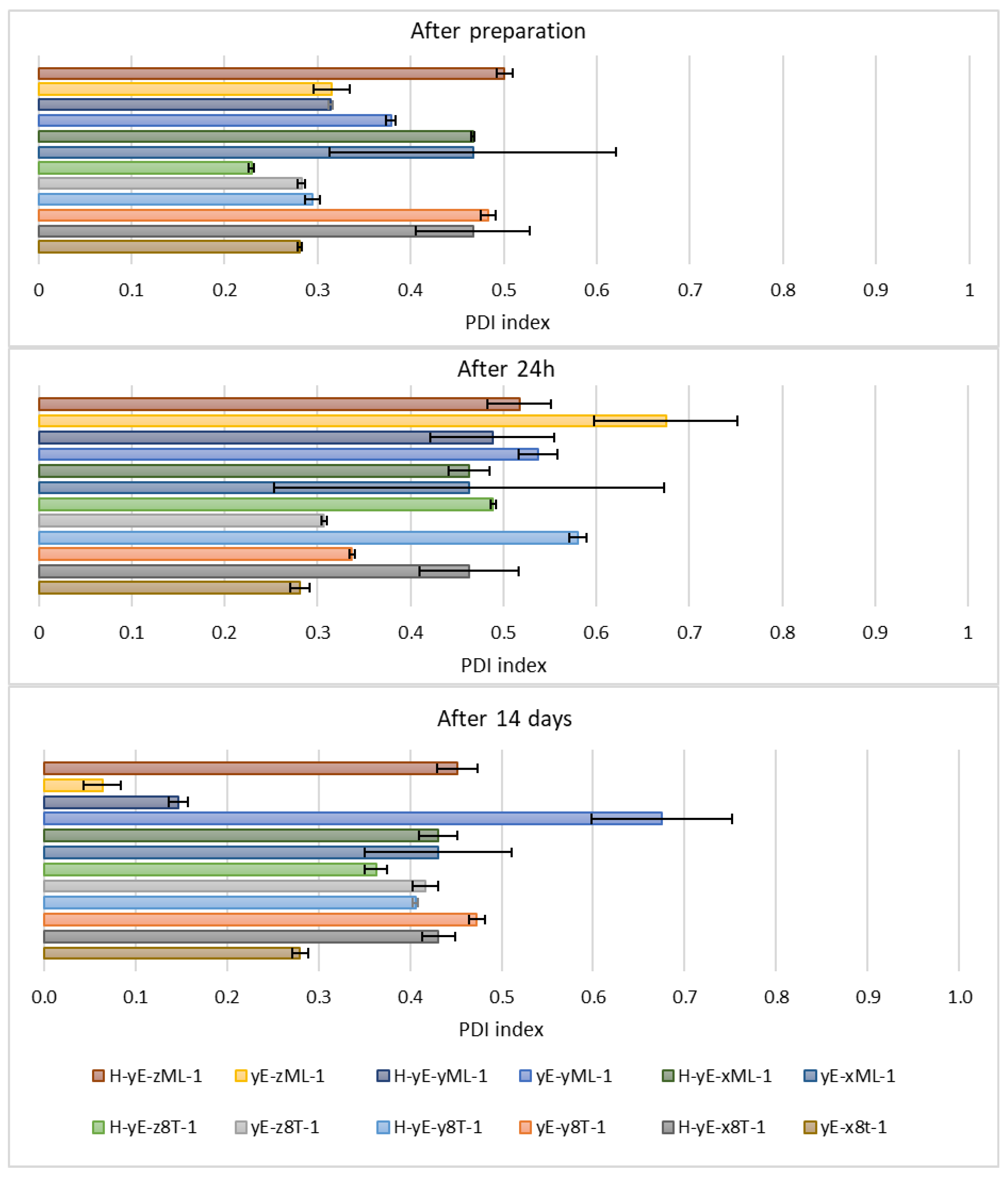 | polydispersity index (PDI) | <0.3 | Approx. 0.15–0.35 | Approx. 0.2–0.4 |
