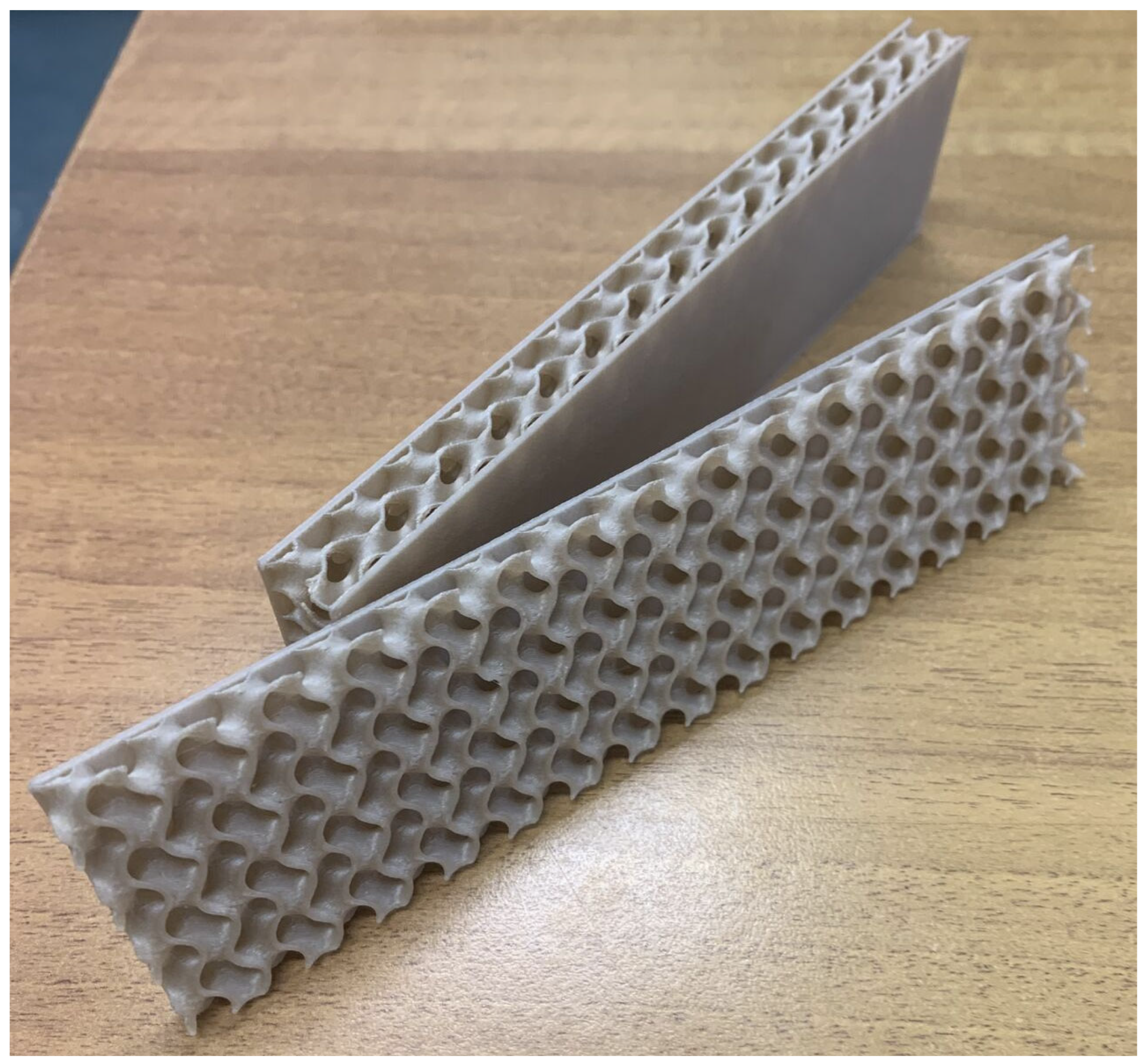 While the sandwich architecture here is sheet-based TPMS, the macroscopic stress–strain shape under bending (linear → peak → softening) remains consistent with prior gyroid-focused studies combining experiments and simulations. Those works emphasize that, at a fixed core density, process parameters that affect the skins and skin–core continuity dominate the global bending curve metrics, consistent with the trends observed at 200 °C [