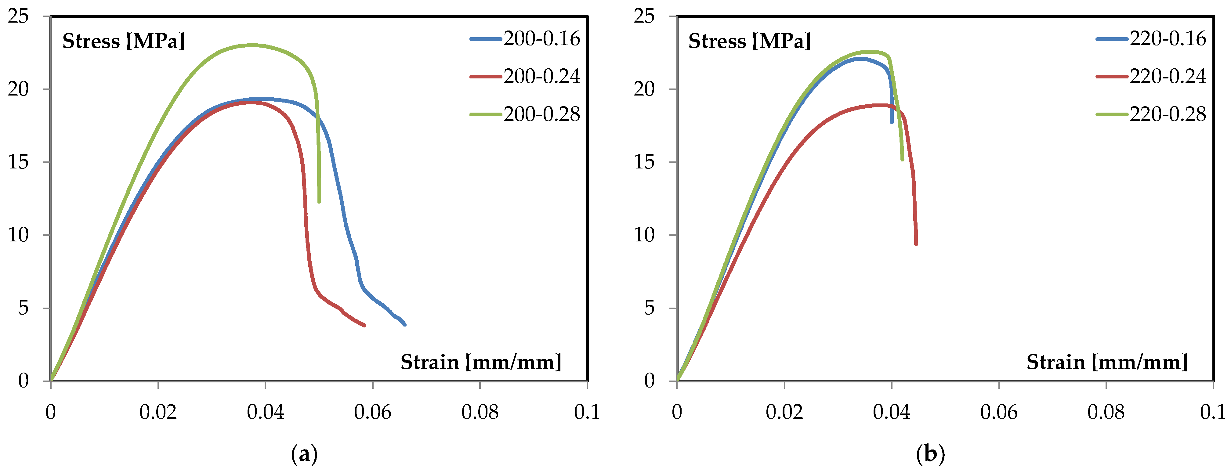 At 200 °C, the maximum stress increases with layer height: 0.16 mm and 0.24 mm reach similar peaks (~19–20 MPa), while 0.28 mm peaks higher (about 23–24 MPa). The onset of nonlinearity occurs at comparable strain for all three batches, but the 0.28 mm trace sustains a larger stress increment before reaching the maximum. This “higher-peak at larger layer height” trend aligns with studies identifying layer height as a primary factor for flexural strength in FFF PLA, due to its influence on road cross-section, road overlap, and the effective load-bearing area of the outer skins [