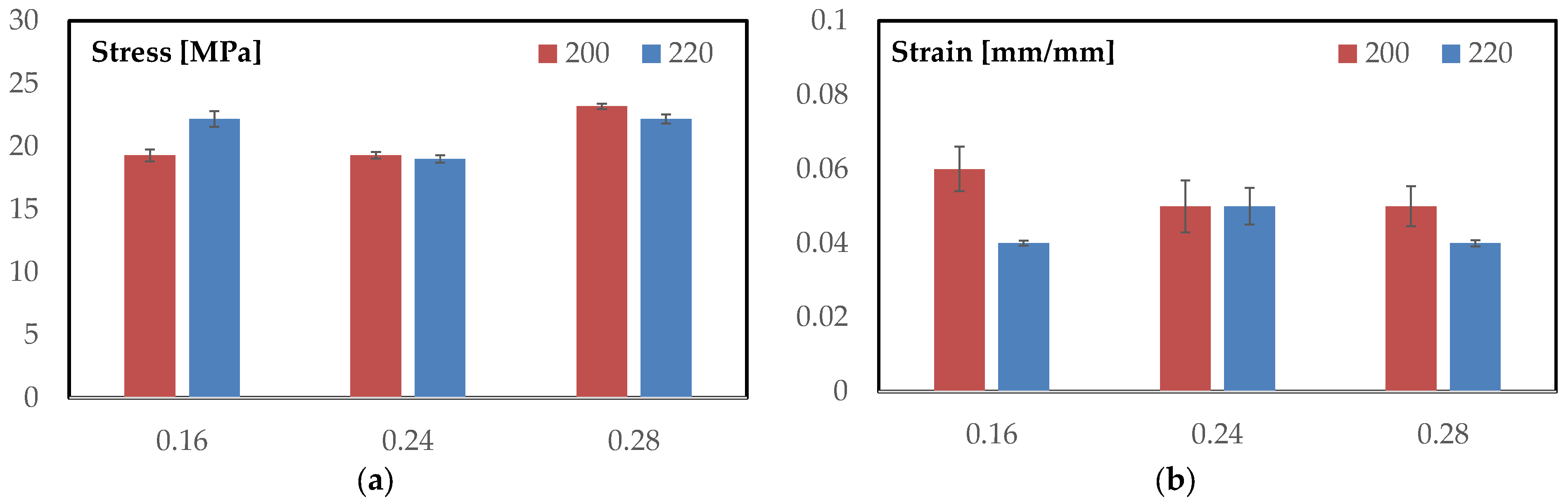 Figure 3a summarizes the maximum flexural stresses for each layer height at both temperatures, with error bars showing one standard deviation. At 200 °C, the ranking is monotonic with layer height: 0.28 mm = 23.2 ± 0.21 MPa (highest), while 0.16 mm = 19.3 ± 0.47 MPa and 0.24 mm = 19.3 ± 0.25 MPa are coincident within the scatter. At 220 °C, the pattern becomes bimodal: 0.16 mm = 22.2 ± 0.61 MPa and 0.28 mm = 22.2 ± 0.36 MPa share the highest value, whereas 0.24 mm = 19.0 ± 0.29 MPa remains distinctly lower. Comparing temperatures at fixed geometry, increasing T from 200 to 220 °C raises the peak for 0.16 mm by +2.9 MPa (+15.0%), leaves 0.24 mm essentially unchanged (−0.3 MPa; −1.6%), and slightly reduces 0.28 mm (−1.0 MPa; −4.3%).