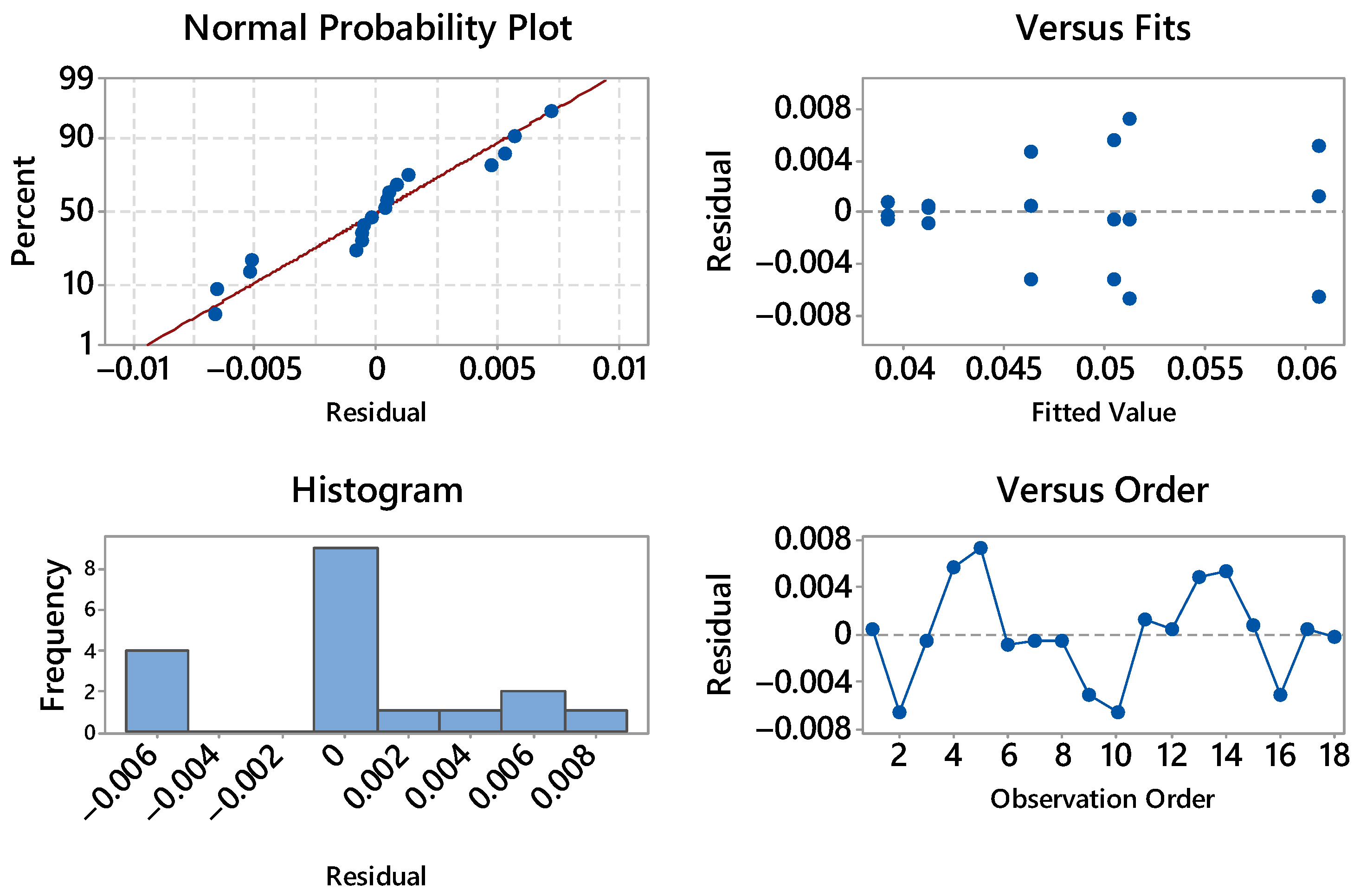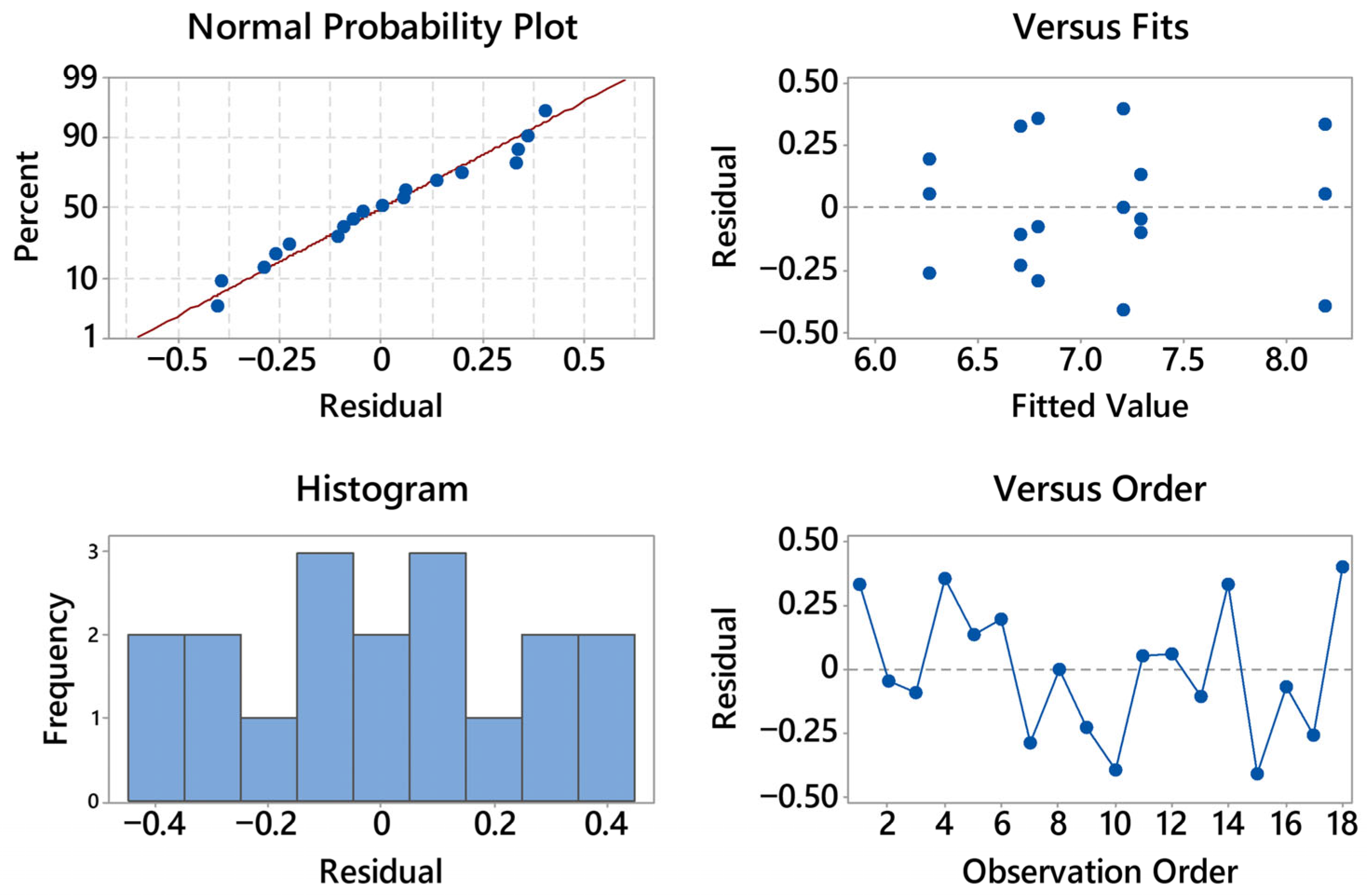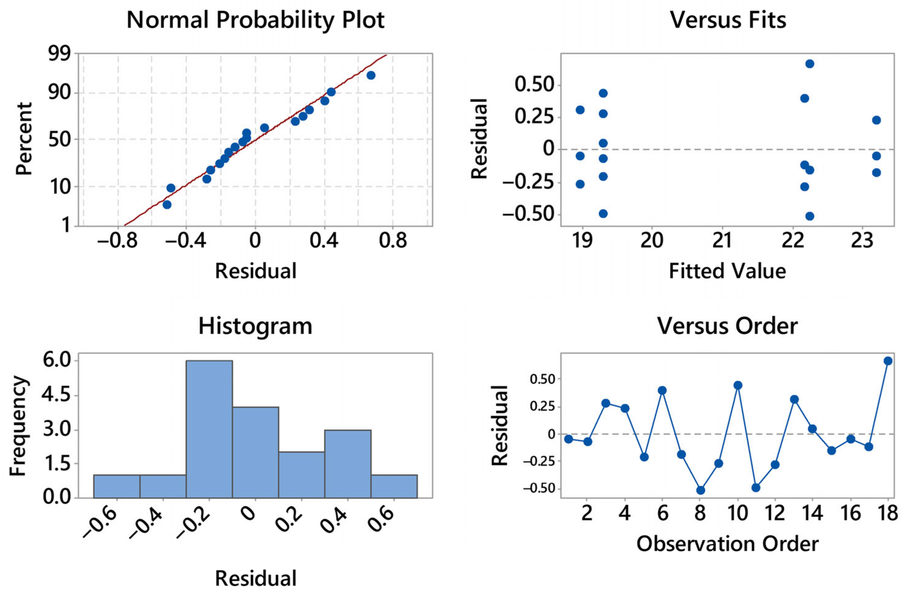 Figure 14. The normal probability plot is nearly linear, with only minor deviations at the extremes; no outliers or influential points are visible. The histogram is approximately symmetric and centered near zero, indicating reasonably normal residual distribution. In the residuals-versus-fitted plot, no curvature or funneling is observed: the spread of the residuals remains constant across the fitted range, suggesting homoscedasticity. The residuals-versus-order panel shows an alternating scatter without drift or cyclic patterns, supporting independence of the observations. Overall, the assumptions required for ANOVA, normality, constant variance, and independence, are satisfactorily met, and no transformation of the data is needed.