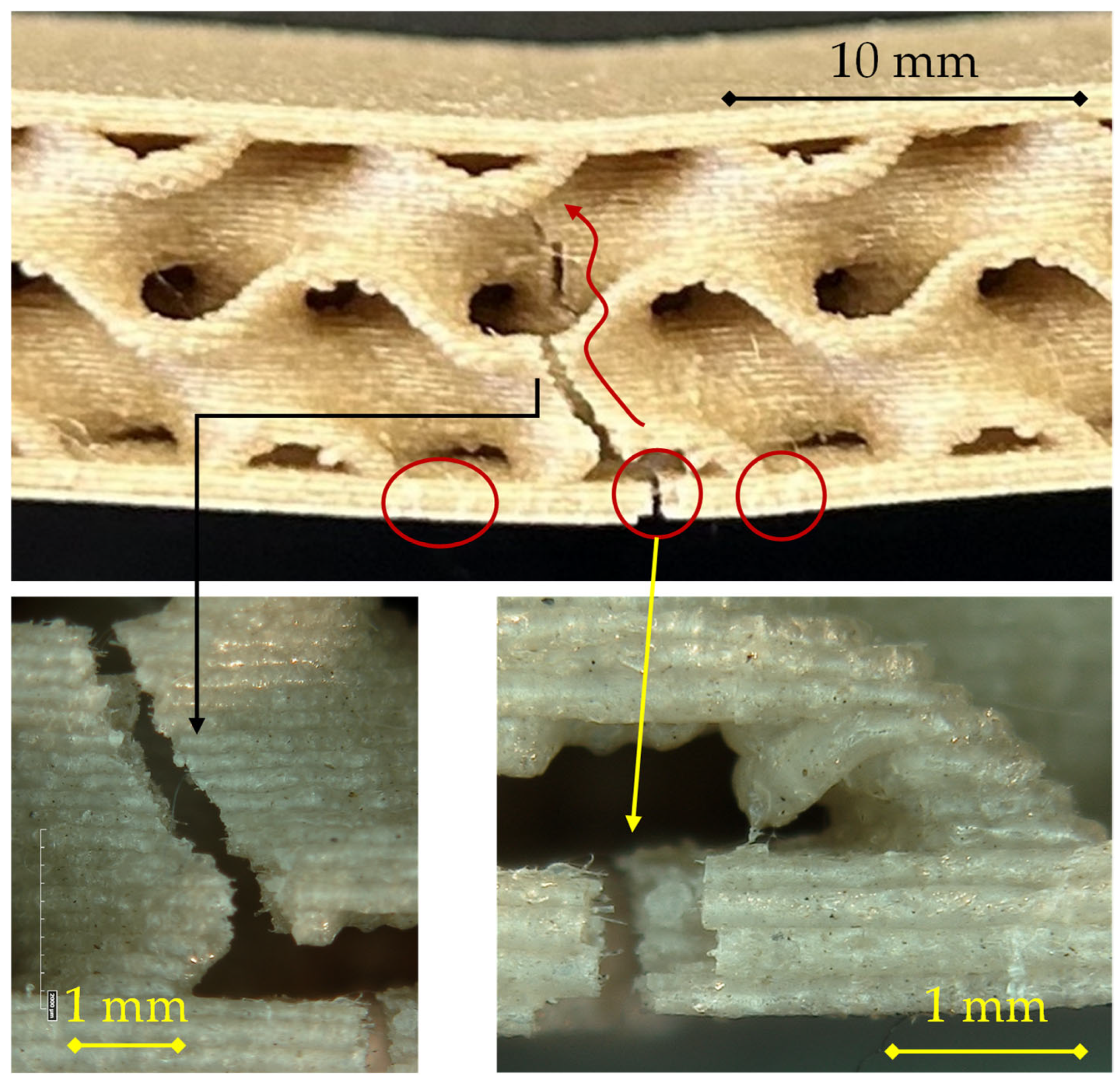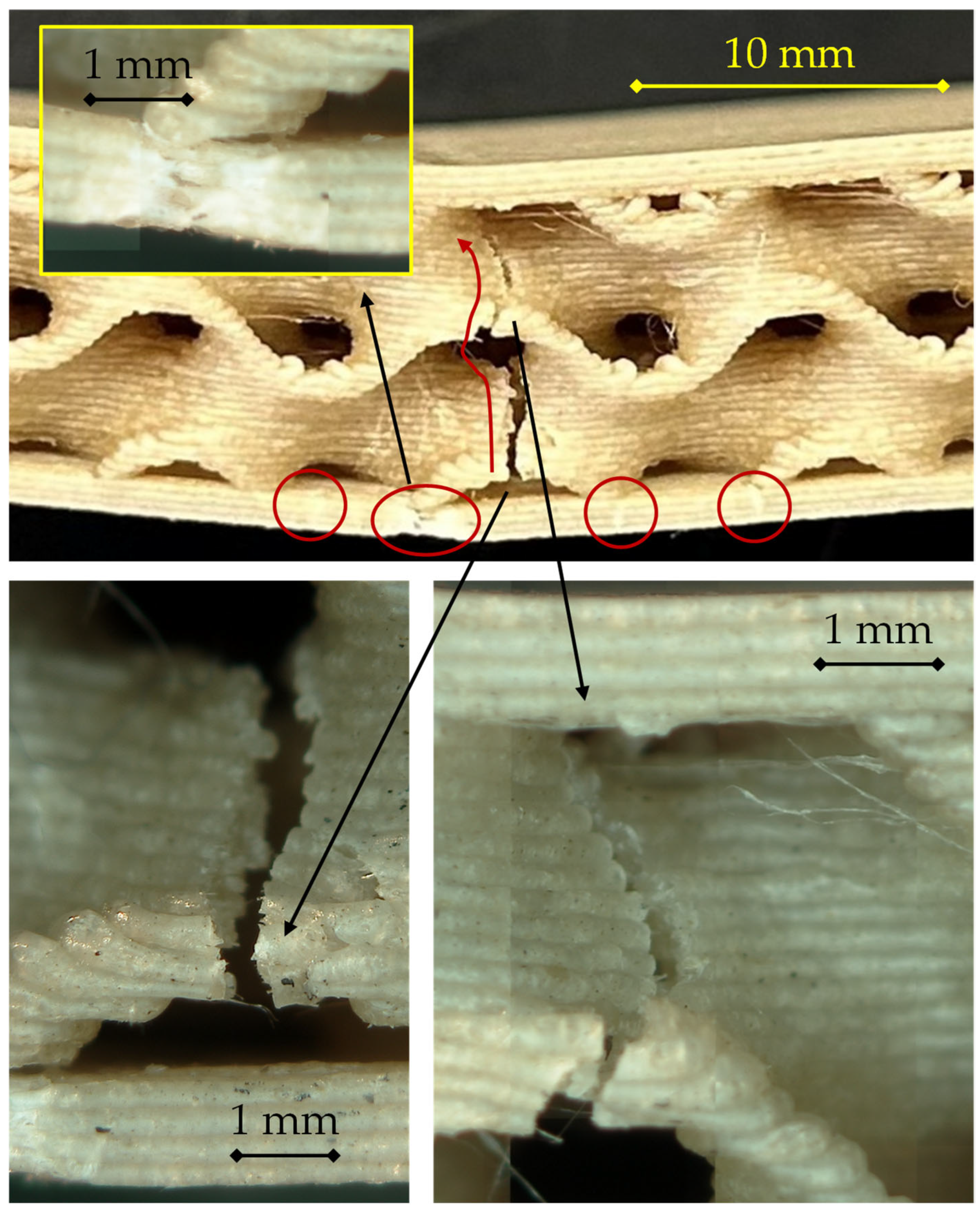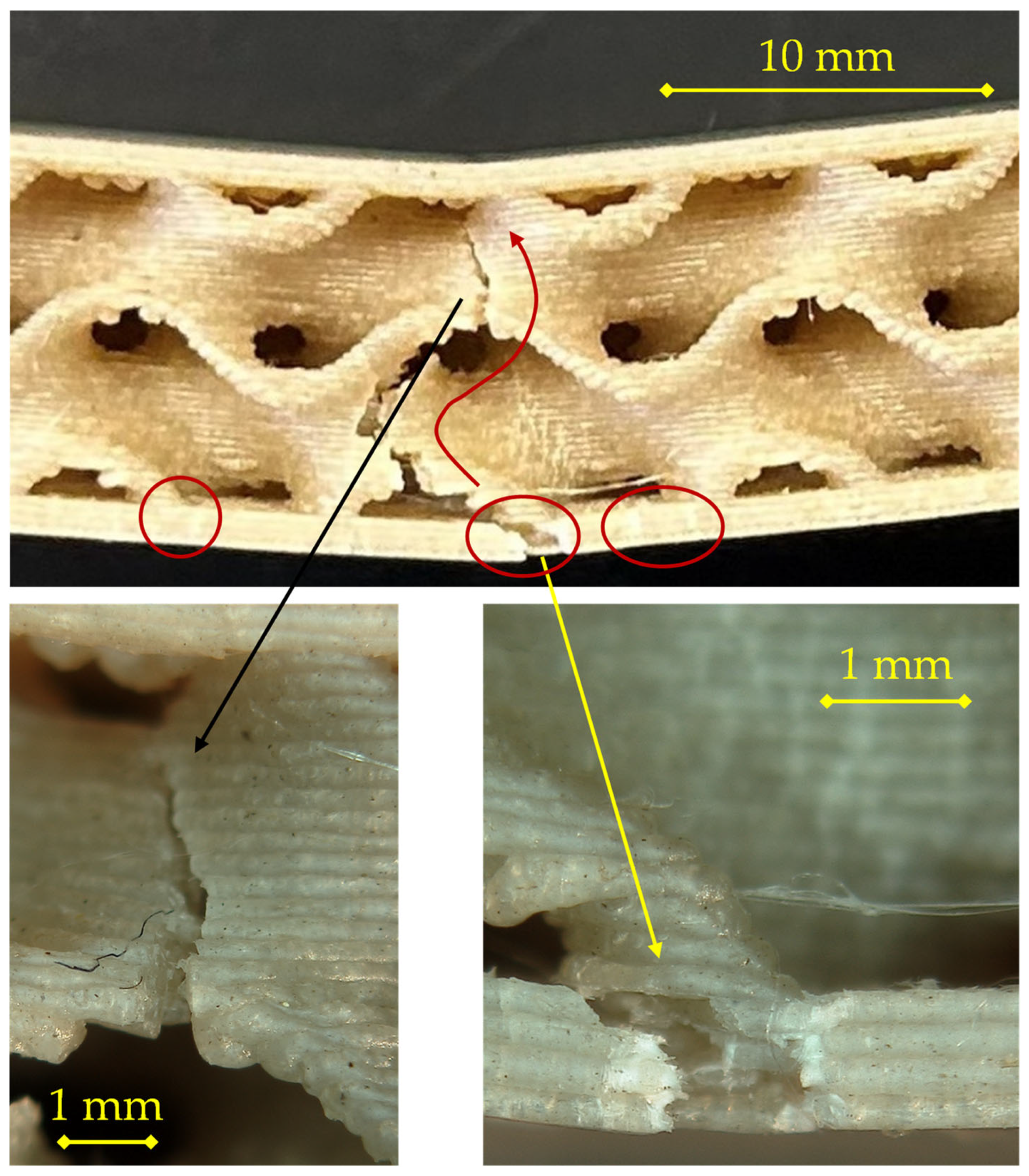 At the early stage of loading, small surface defects and printing-induced voids in the outer skin act as stress concentrators. A primary crack nucleates at mid-span in the lower skin (central circled region) and propagates along the raster direction of the deposited filaments. As deformation increases, the crack progressively opens, causing local separation of the bottom skin and limited delamination at the core–skin interface, as evidenced by the secondary circled cracks on either side. The fracture then turns upward into the gyroid wall, following a tortuous path governed by stress redistribution within the core.